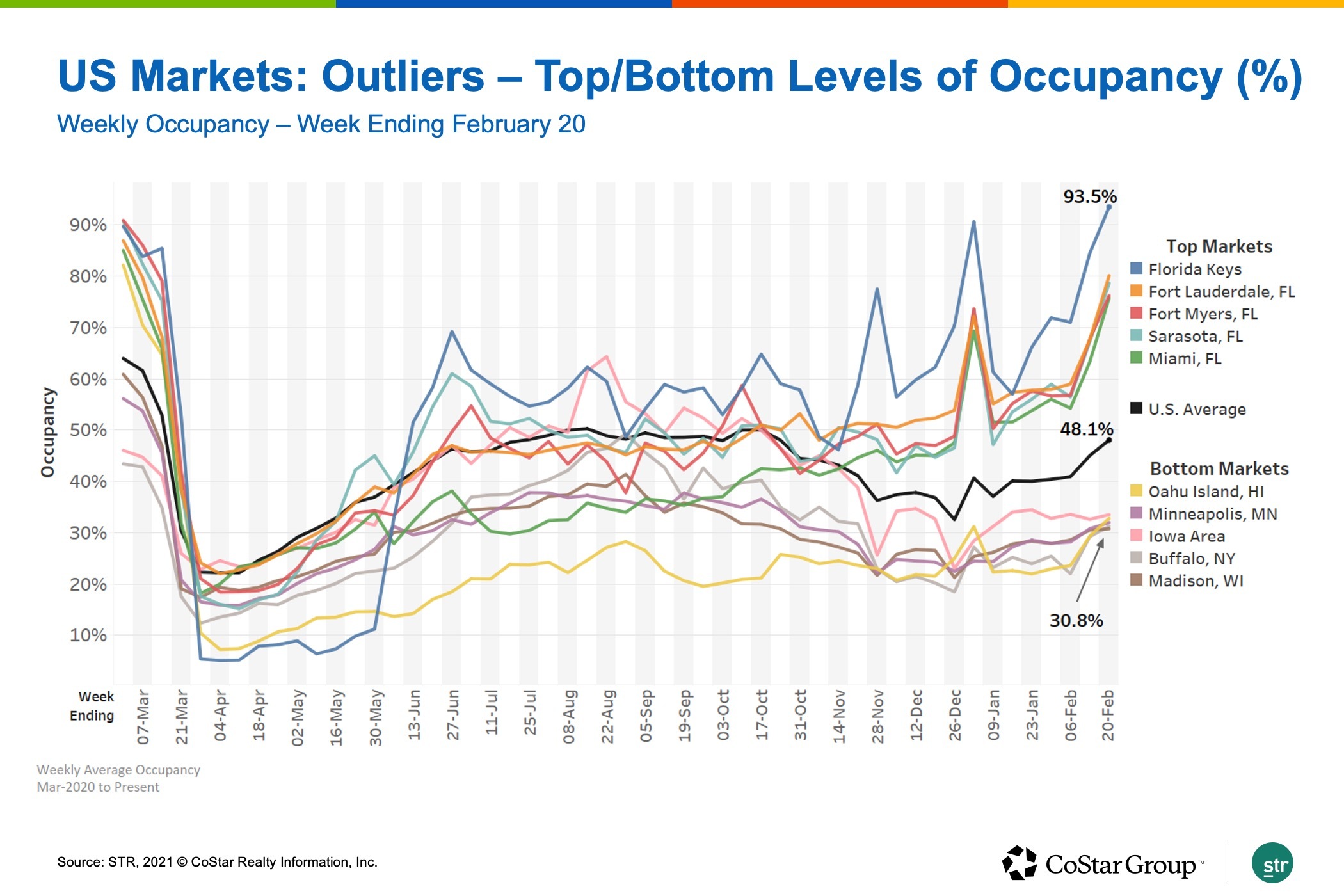 A look at weekly hotel occupancy over the past year shows several Florida markets were among the top markets in the U.S., outpacing the 48.1% nationwide occupancy average, Garner said.