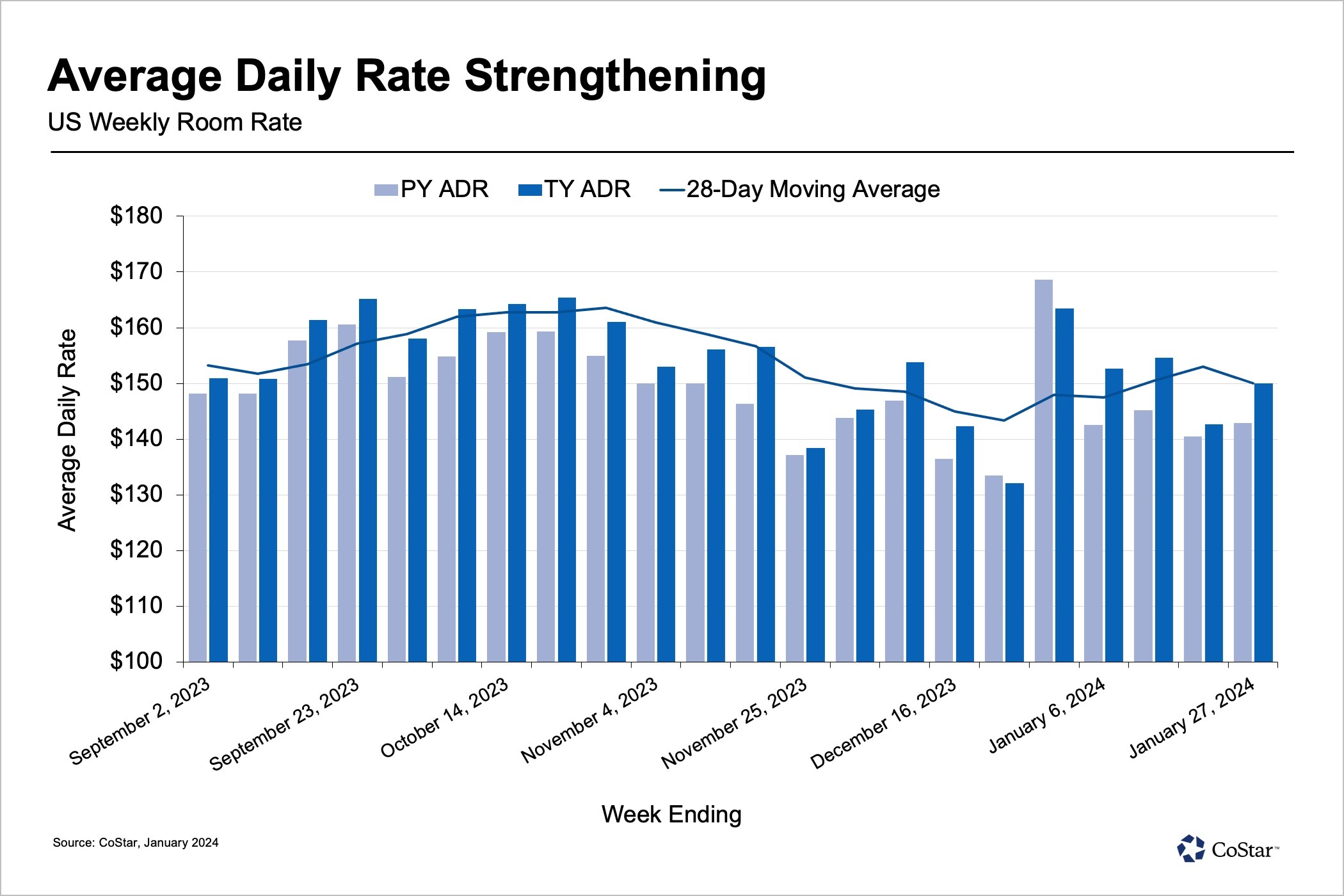 U.S. hotel performance is expected to steadily improve over the next several weeks as business and group travel return, reaching a seasonal peak in mid-March. Super Bowl week is expected to boost performance in the host city Las Vegas and will likely affect U.S. performance. An early Easter will affect March and first-quarter year-over-year comparisons.