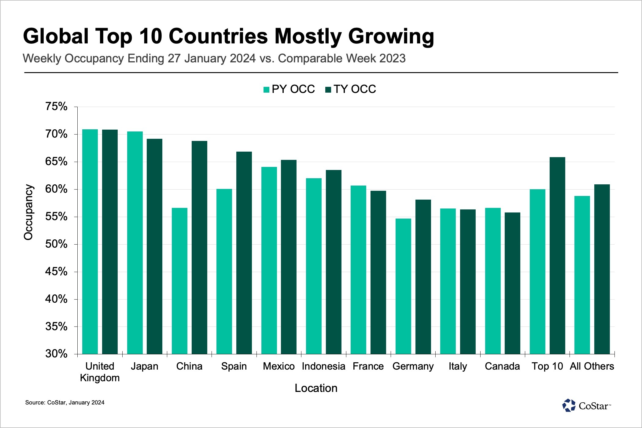 Outside of the U.S., the strongest occupancy performance within the top 10 countries based on supply came from China, up 12.2 percentage points.