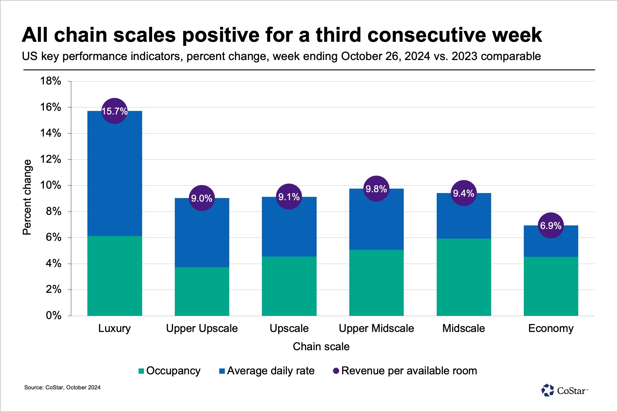 The week of Oct. 20-26 was a clean week with no calendar or holiday shifts to distort the performance of U.S. hotels. The last full week of October achieved hotel demand gains from ongoing hurricane recovery efforts, Taylor Swift, college football, and the squeezing in of conferences and meetings ahead of Halloween and the election.