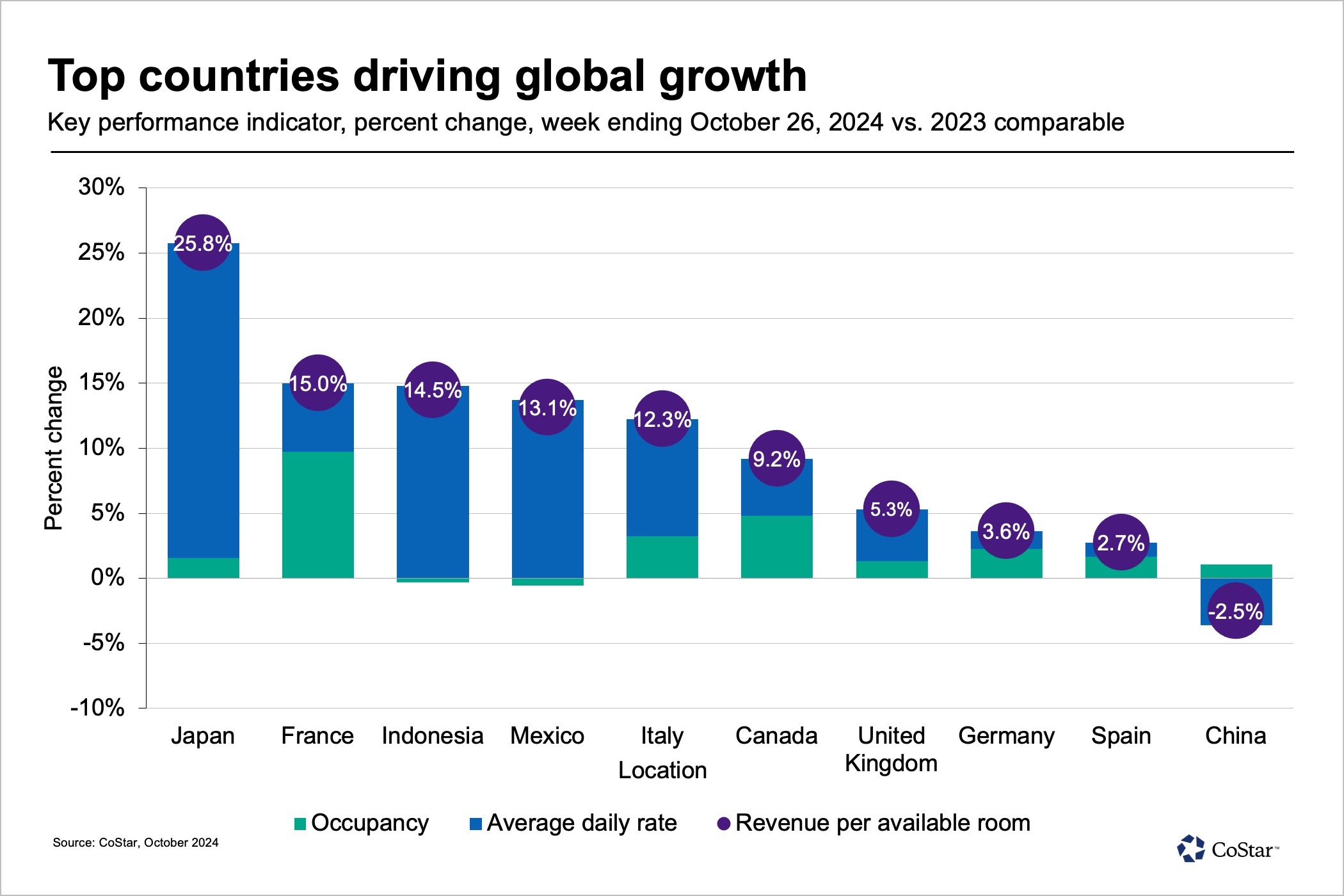 Demand outside the U.S. increased by more than 3.3 million rooms with 75% of countries seeing growth, led by China, which accounted for more than a fifth of that gain. Nearly half of the demand growth came from the top 10 largest countries including Canada, France, Germany, Japan, Spain and the United Kingdom.