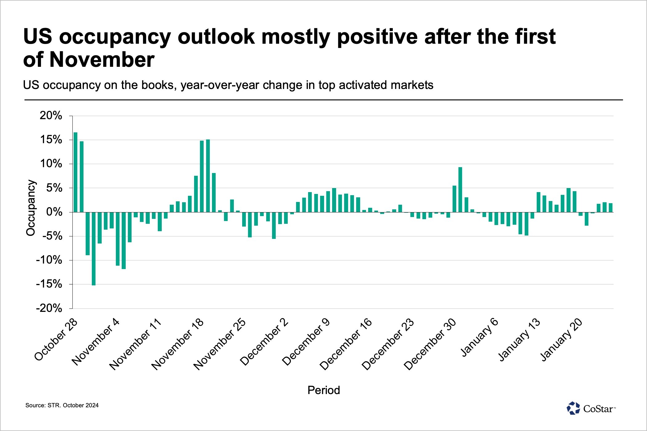 Travel compression ahead of Halloween and the election along with key college football matchups and fall travel drove strong U.S. hotel demand in the week and will lead to solid RevPAR for the month of October. Looking ahead, the next two weeks will be much different in the U.S. given Halloween and the election. We expect to see positive RevPAR comparisons in November, but much less than what is predicted for October.