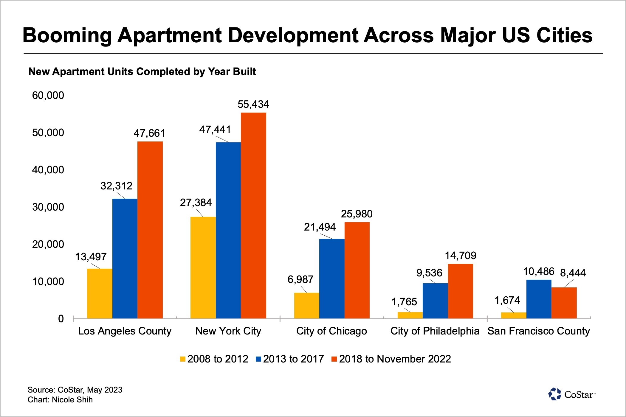 Construction of new apartments in those areas had fewer parking spaces per unit built between 2018-2022 than in 2008-2012. The only exception in the group: Los Angeles County, America's largest county by population. It had more than 1.4 parking spaces built per apartment unit between 2018-2022, up from a little more than 1.2 parking spaces built per unit between 2008-2012, according to CoStar data.