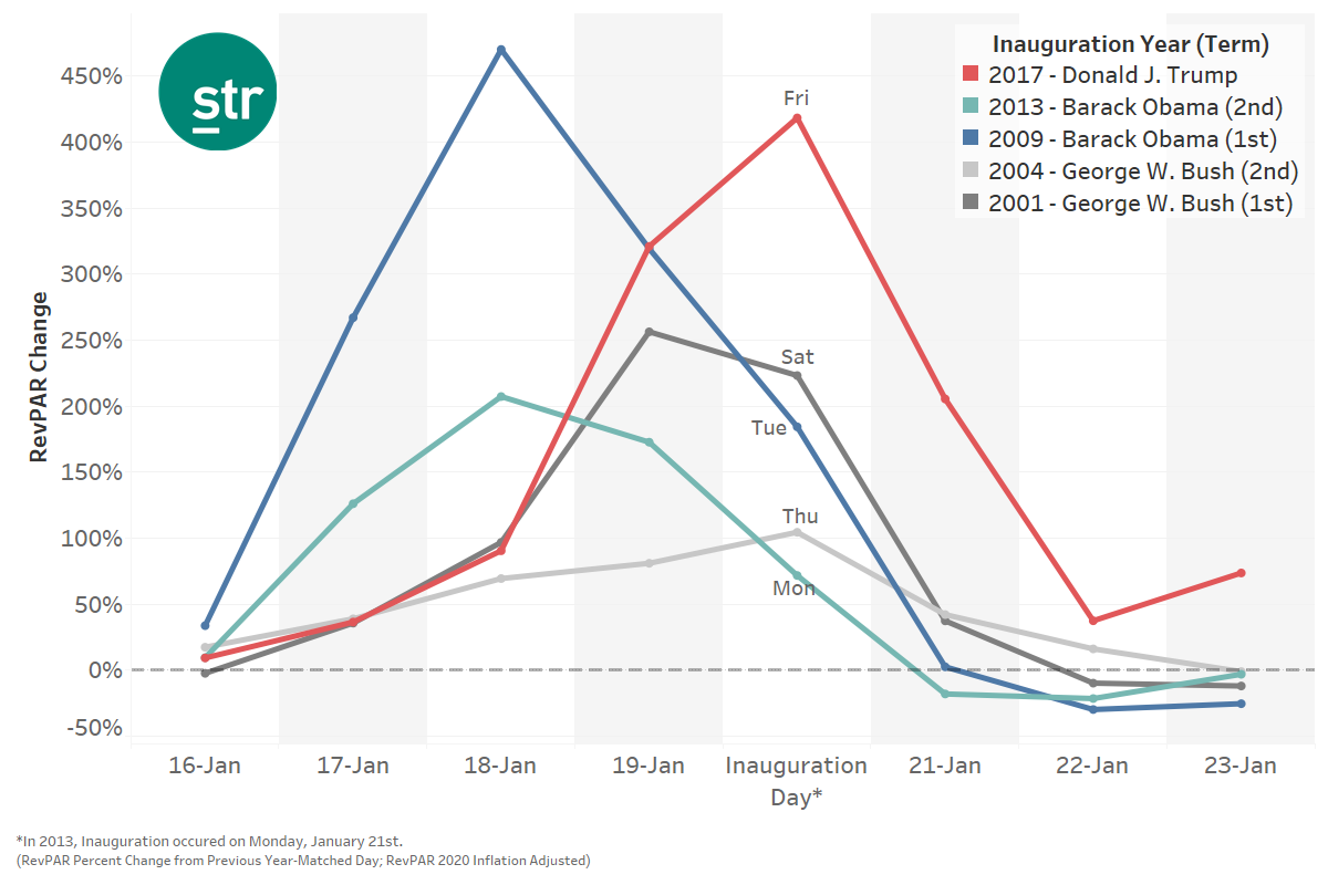 Les inaugurations présidentielles en 2009 et 2017, marquant les premiers mandats du président Barack Obama et du président Donald Trump, ont donné lieu à des recettes de salle « plus de trois fois supérieures à la normale » les jours qui ont précédé la cérémonie, a déclaré M. Brian Riley, analyste de recherche principal au sein de l'équipe d'analyse du marché de STR. STR est une division de CoStar, qui publie Hotel News Now.