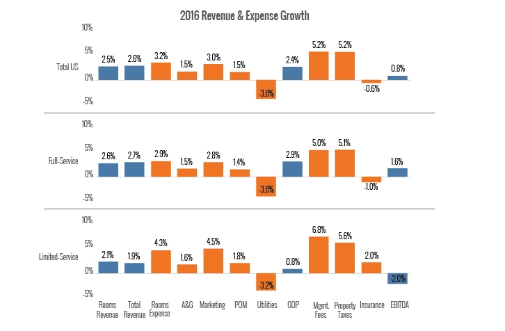 Full-service hotels achieved 2.9% GOP growth in 2016 versus only 0.8% GOP growth for limited-service hotels. Profit growth in the limited-service segment was muted by significant increases in rooms expense, marketing, management fees and property taxes. However, limited-service hotels are much more efficient with a GOP margin of 47.9% in 2016, which is still much greater than the 35.5% GOP margin for full-service hotels.