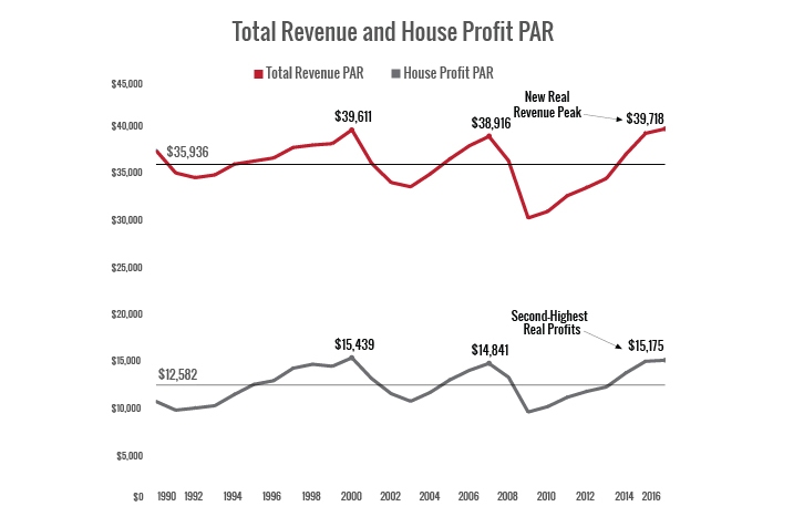 U.S. hotel revenues set a new bar in 2016, as total revenues surpassed the previous overall peak on an inflation-adjusted basis. The previous peak for inflation-adjusted revenues occurred in 2000. In addition, 2016 real profits were greater than every other year except for 2000.