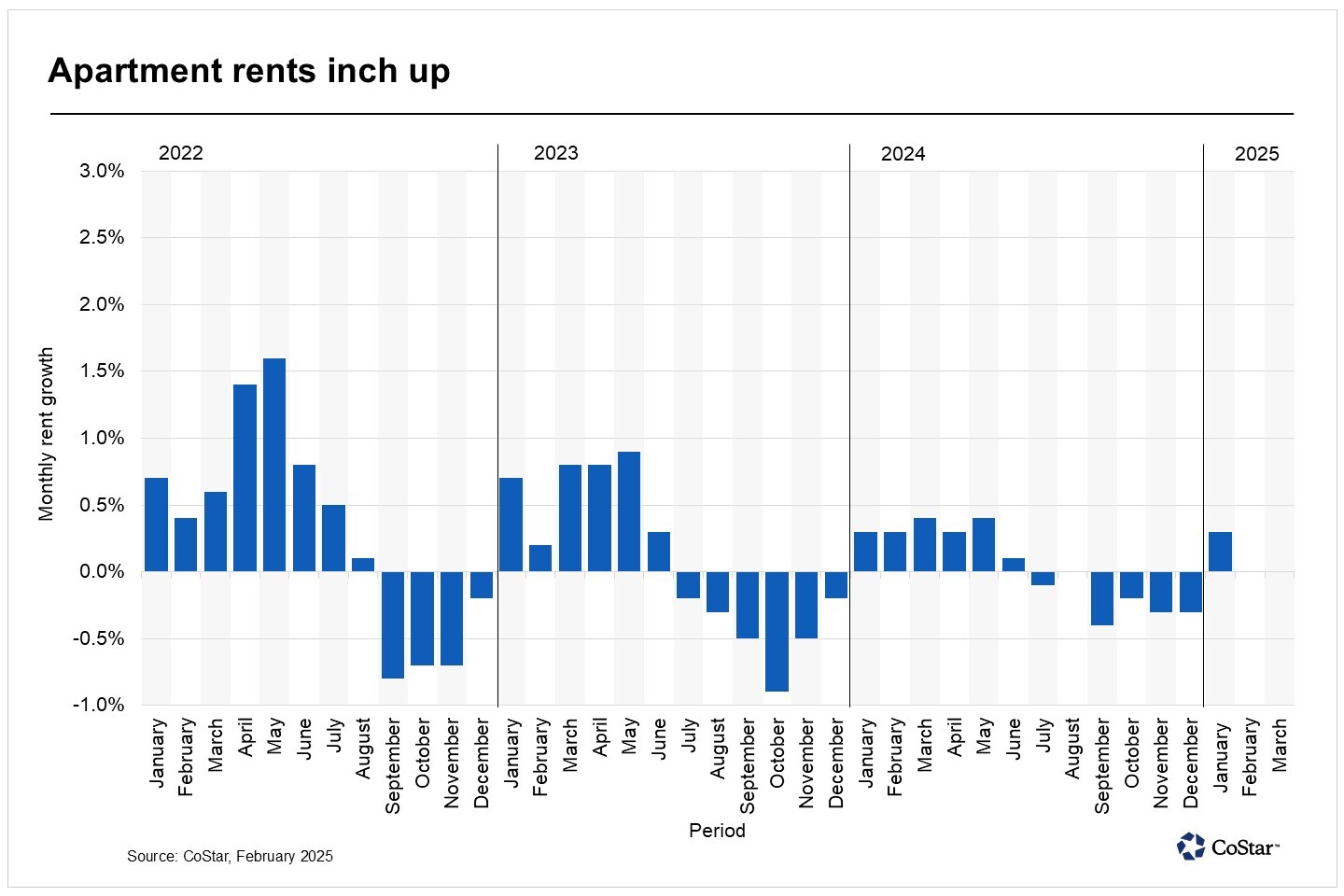 San Diego’s apartment landlords enjoyed their first month of positive rent growth, on average, since June, when the region’s average market asking rents rose 0.3% month over month during January. Rents fell every month in the second half of 2024, except during August when they were flat.