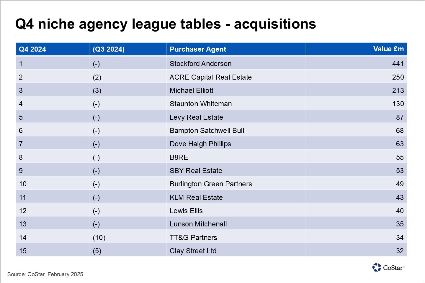 ACRE Capital Real Estate claims top position in the Q4 2024 niche acquisitions table. In aseries of deals, its largest is for representing GoldenTree Asset Management in the acquisition of Project Apex from Abrdn Property Income Trust for £315 million. Glenlyon Real Estate places second, following its advice to Redevco in the acquisition of 16 retail parks across the country from Oxford Properties and M7 Real Estate for £518 million. TT&G Partners takes third place for representing Feldberg Capital and Henry Boot Developments in the purchase of the Origin JV portfolio comprising four industrial units for £115 million.