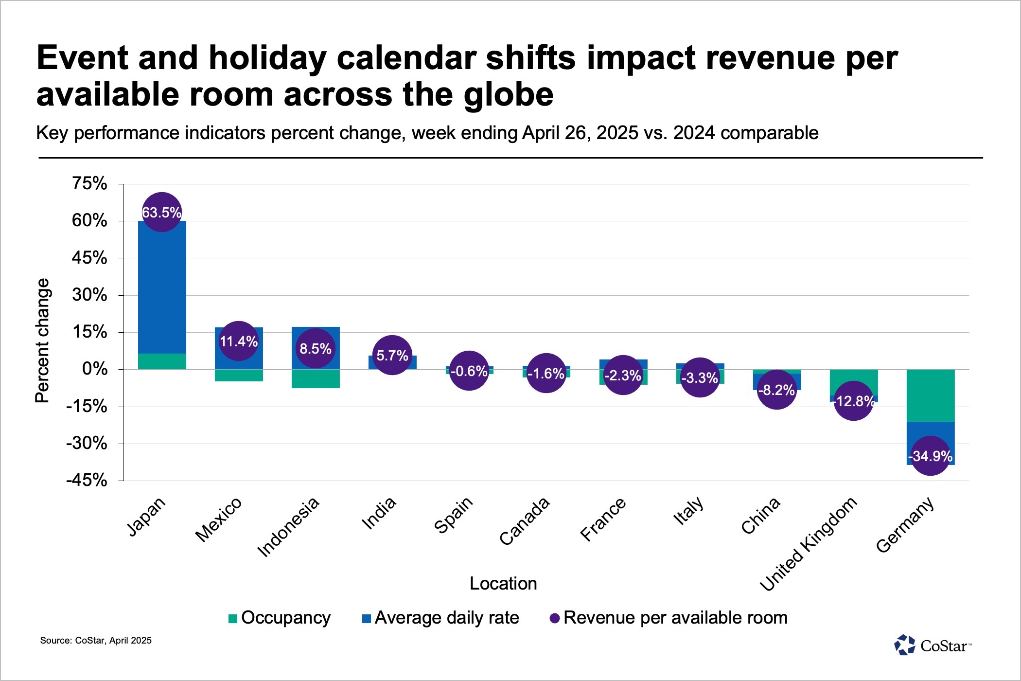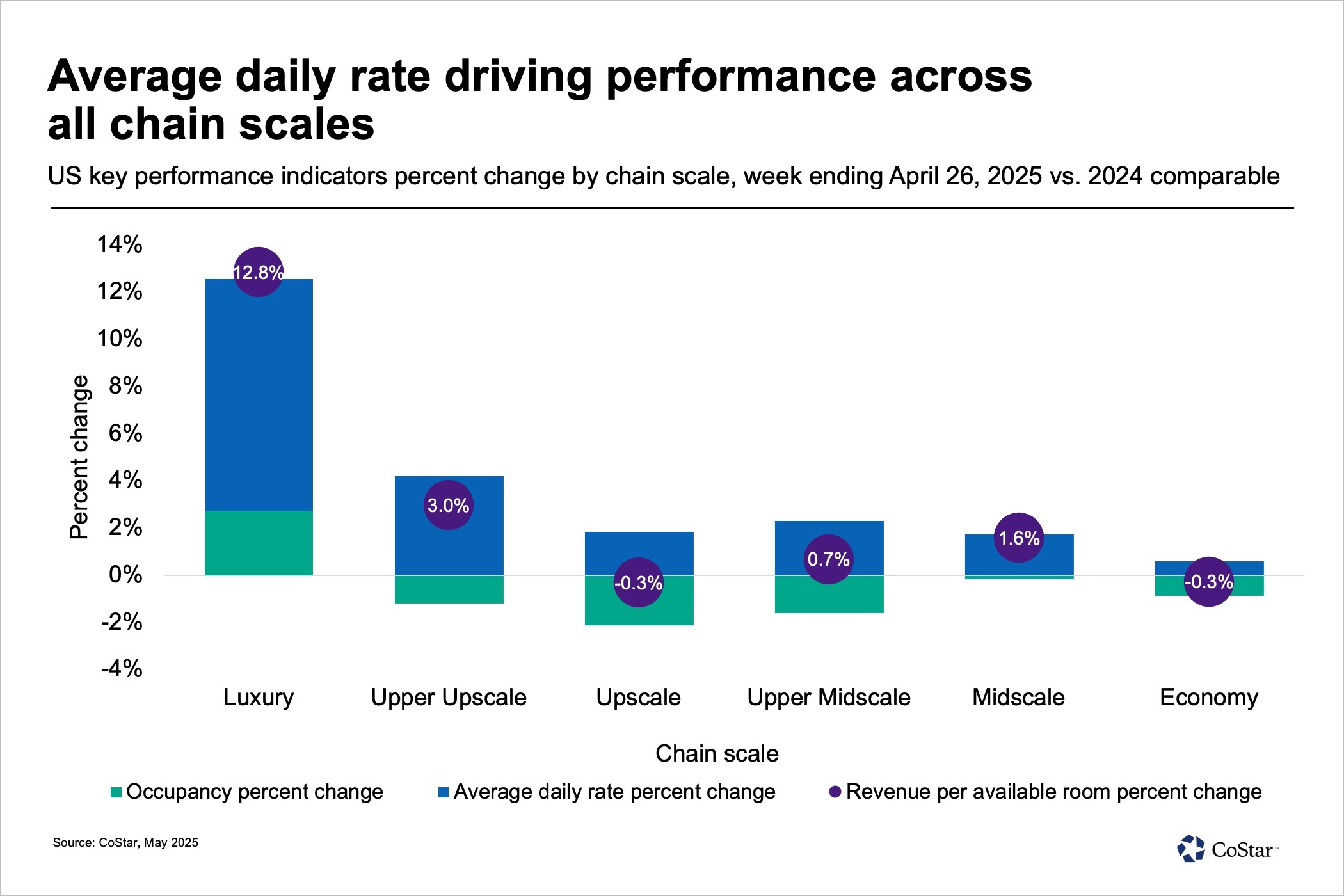 Through a combination of calendar headwinds and tailwinds, U.S. hotel revenue per available room (RevPAR) grew 3.2% during the week of April 20-26, 2025.