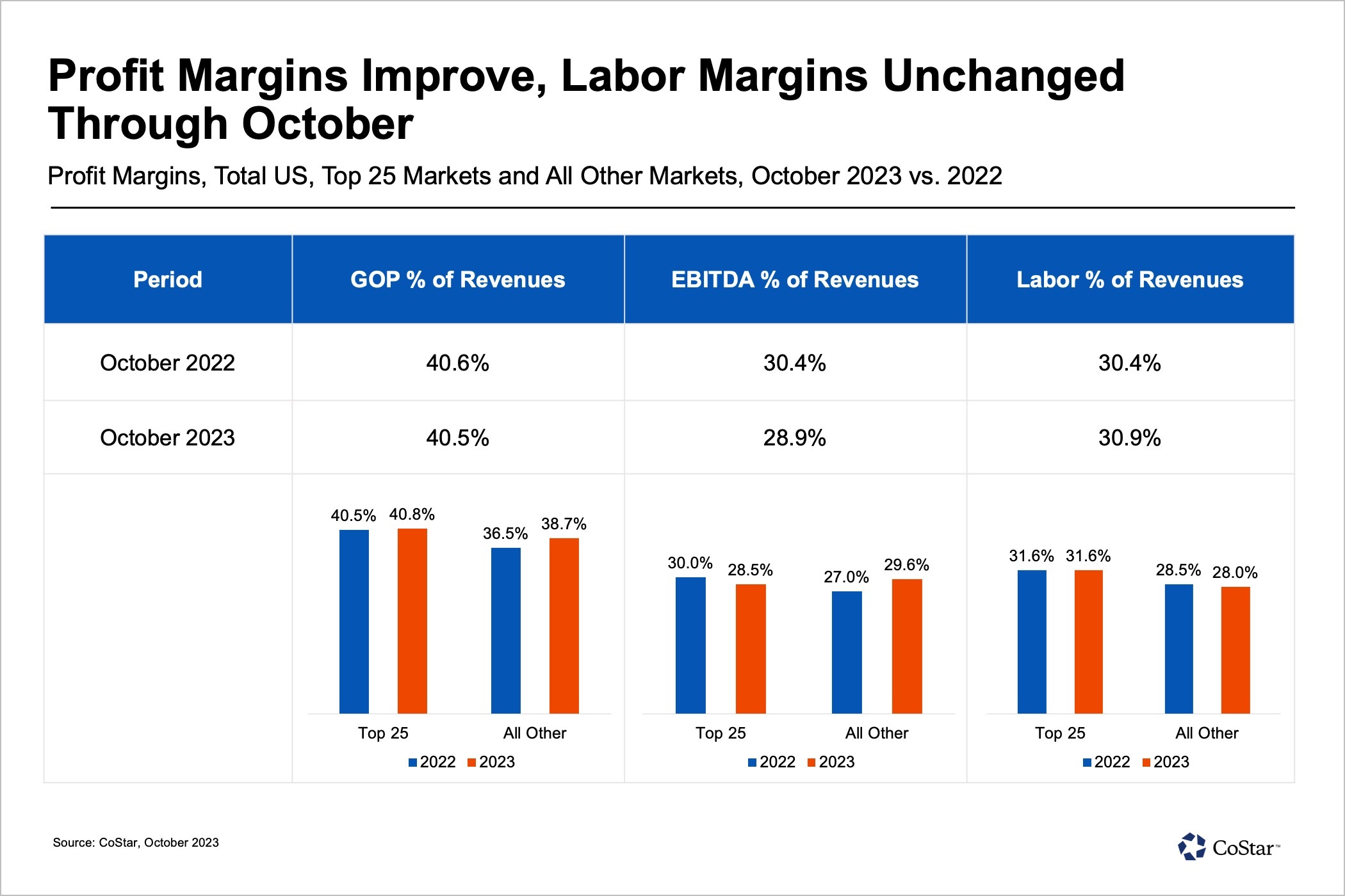 The U.S. top 25 markets reported 4% growth in gross operating profits per available room (GOPPAR) in October, the strongest since March 2023. Both total revenue per available room (TRevPAR) and labor costs per available room (LPAR) increased 3.7% year over year, making this the third consecutive month of softening LPAR growth.