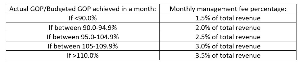 Additionally, I suggest that these calculations be made monthly, not annually. Each month should stand on and be evaluated on its own performance. That way, if, for example, the first quarter is poor, then the operator is still motivated to do their best for the remainder of the year, since they still can make high percentages of revenue. And conversely, if they knock it out of the park early in the year, there is no risk that they will rest on their laurels, since they can continue to drive their fees in future months. As a caveat, it is fair to guarantee some level of compensation to the operator via a minimum monthly fee that triggers in the case that the sliding scale calculation is too low to keep an operator fully engaged.
