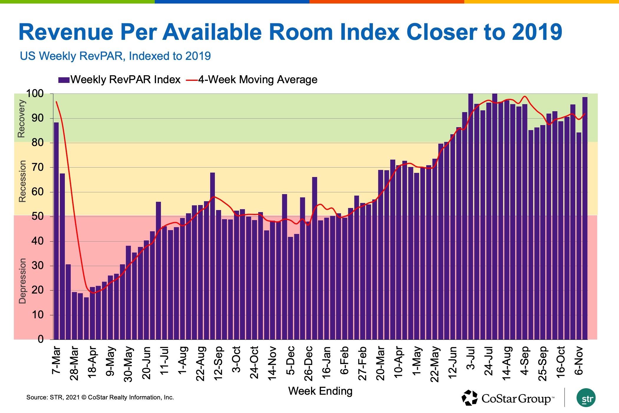 For the week ending Nov. 13, the U.S. hotel industry sold 704,000 more room nights than it did the previous week, according to the latest “Market Recovery Monitor” report by STR, CoStar’s hospitality analytics firm.