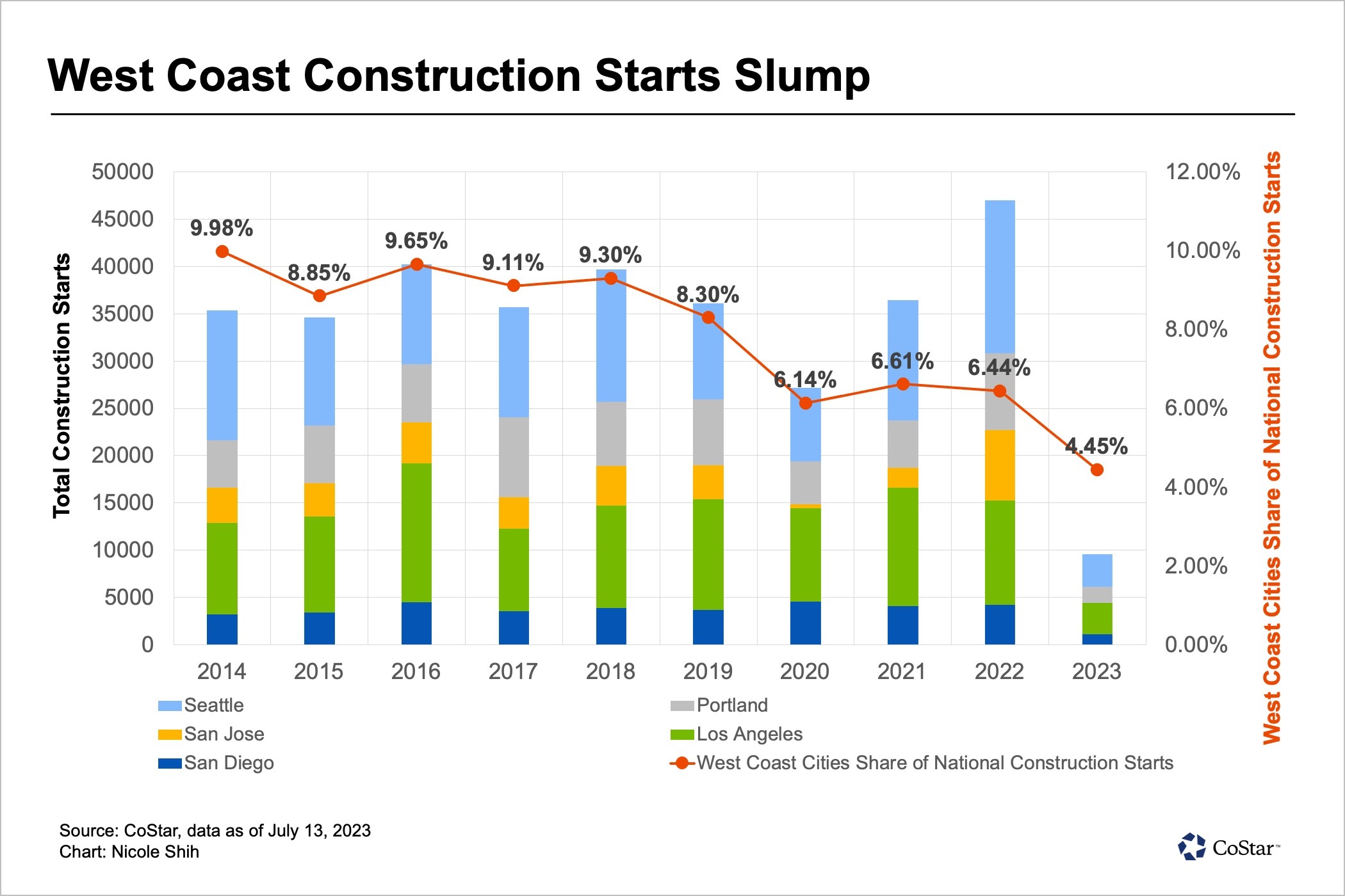 Multifamily construction starts are also falling nationally because rising interest rates make it more difficult for developers to build profitably. The West Coast, though, stands as an outlier to other faster-growth Sun Belt markets where construction continues at a faster clip. That's not only because of demographic shifts but also partly because of red tape and high construction costs developers face building in California, Oregon and Washington.