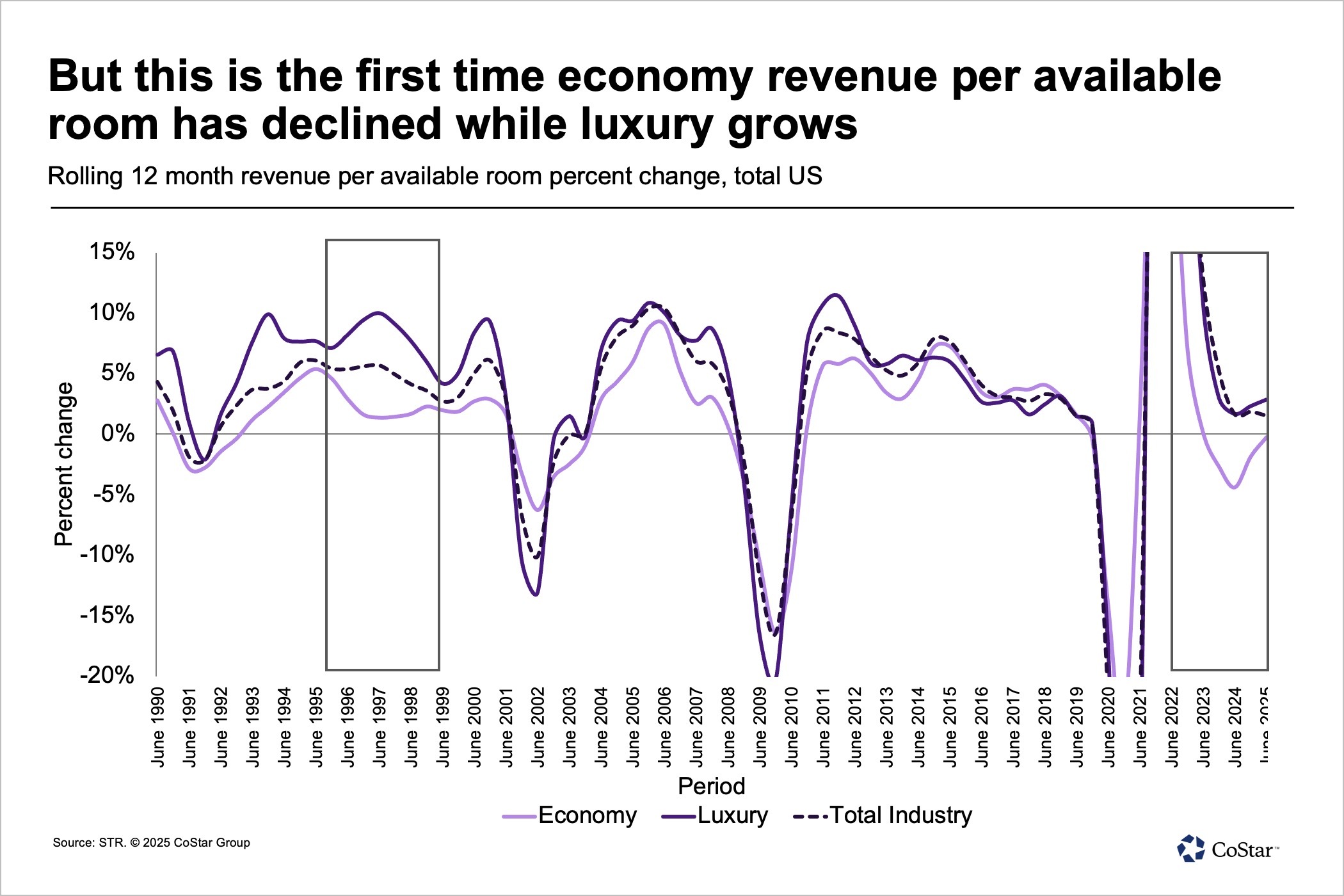 Such performance patterns mirror the recessionary periods of the early 2000s and the 2008 Great Recession, but the significant difference now is bifurcation. In other words, RevPAR for economy hotels has declined while RevPAR for the luxury segment is growing.