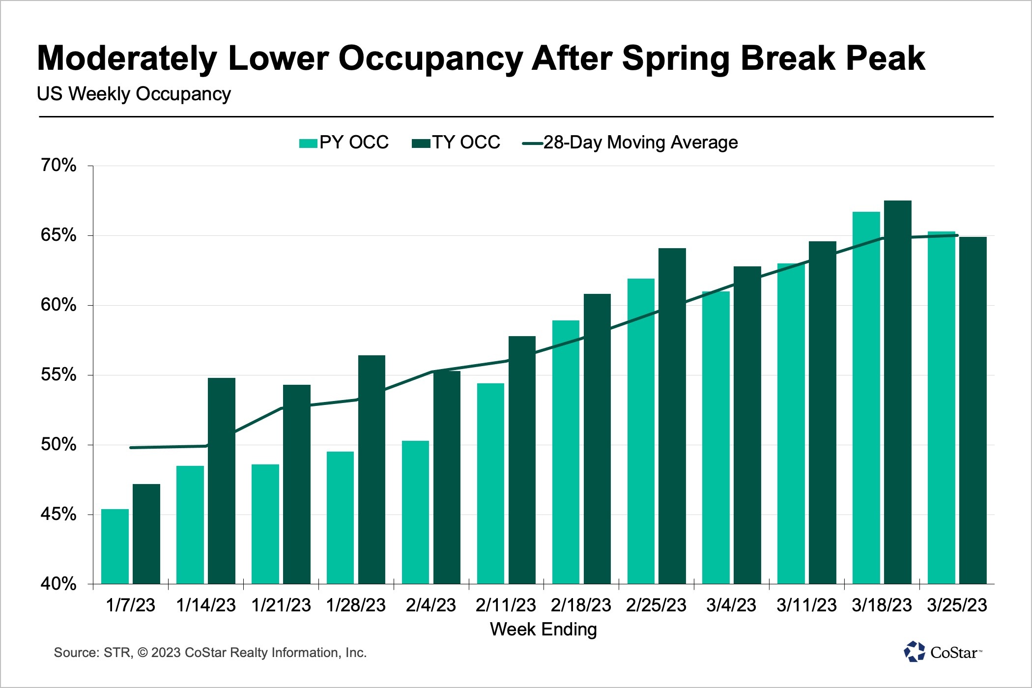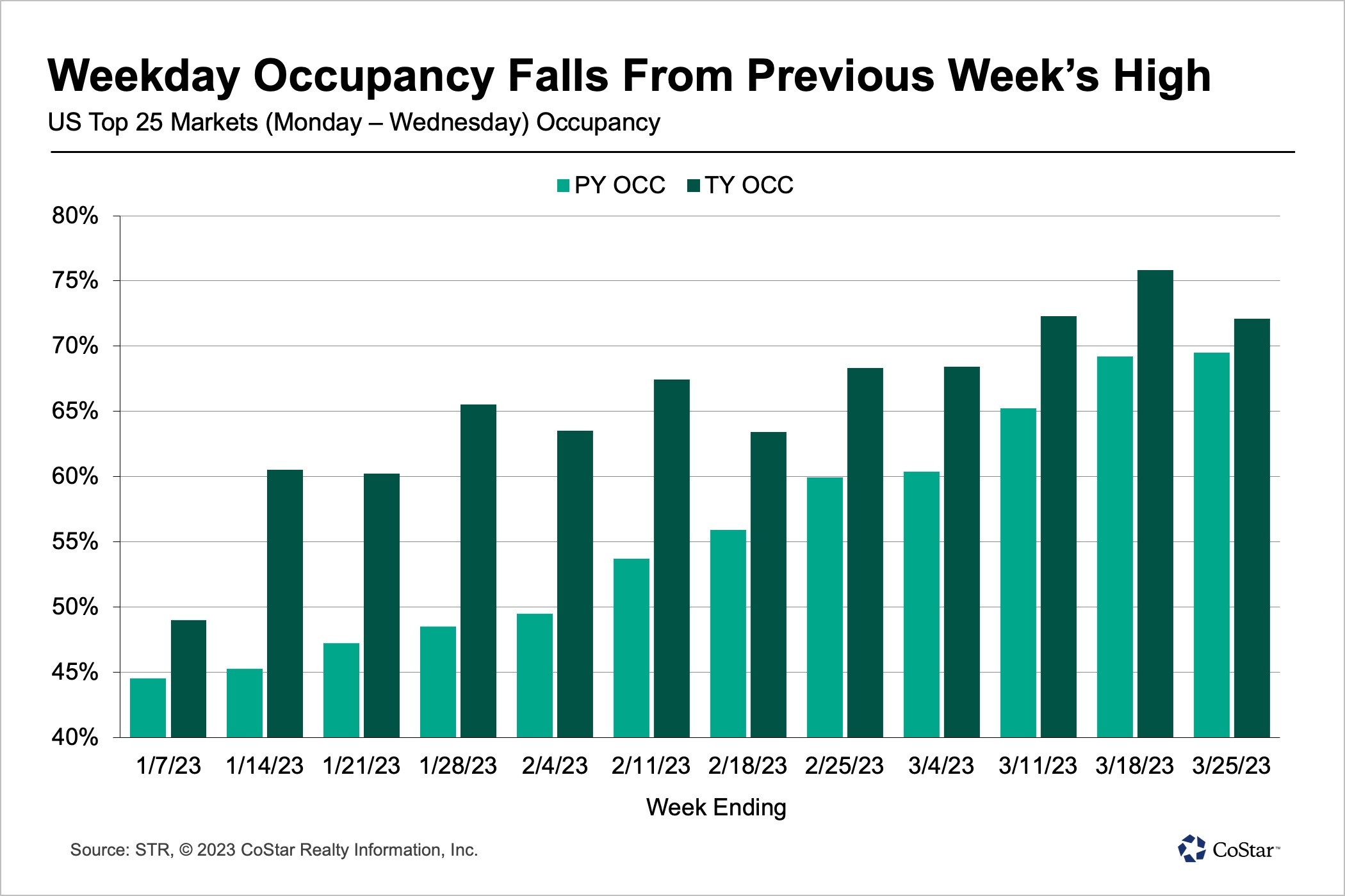 Coming off a strong week, the top 25 U.S. hotel markets reported a 3.2-percentage-point decline in occupancy to 72.3%. That decline is consistent with historical weekly performance patterns as demand/occupancy normally recedes after peaking with spring break.