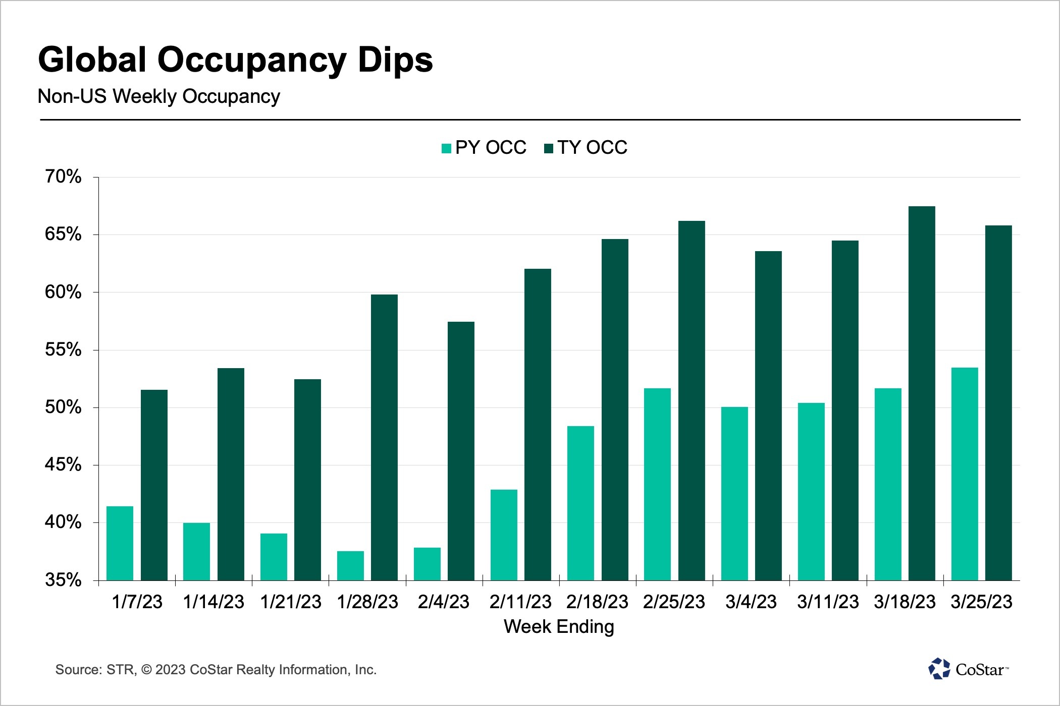 After surging with the peak of spring break travel in the U.S., weekly global hotel performance expectedly dialed back.