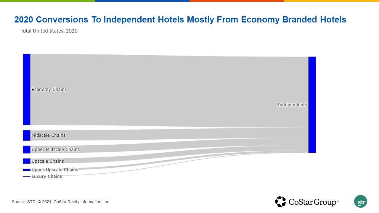 In 2020, conversion activity in and out of the independent chain scale showed a pattern that matches that of past years. Specifically, most brands that gave up their franchise and became independent were economy branded hotels. In all, 470 hotels converted to independent from various chain scales.