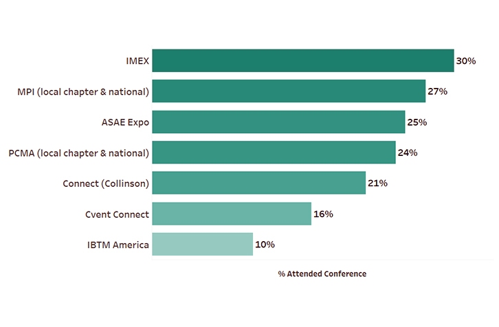 IMEX America tops the list of conferences attended by meeting planners, followed closely by MPI, ASAE Expo and PCMA, the study shows. Connect (Collinson), Cvent Connect and IBTM round out the list of the top seven conferences. IMEX America and Cvent Connect take place annually in Las Vegas, while the other conferences rotate around the country.