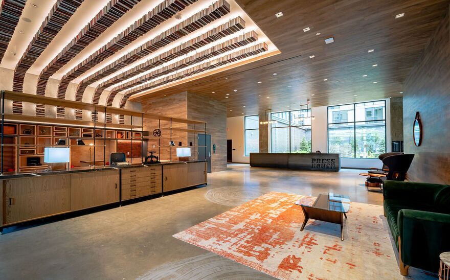 Walk into the lobby of the Press House Apartments and the first thing you’ll notice is plentiful custom art, highlighted by an array of books hanging from the ceiling. The development team took great pride in preserving most of the 1931 warehouse next door, with components from an original printing press and the original warehouse doors finding a new home in the Press House Apartments.