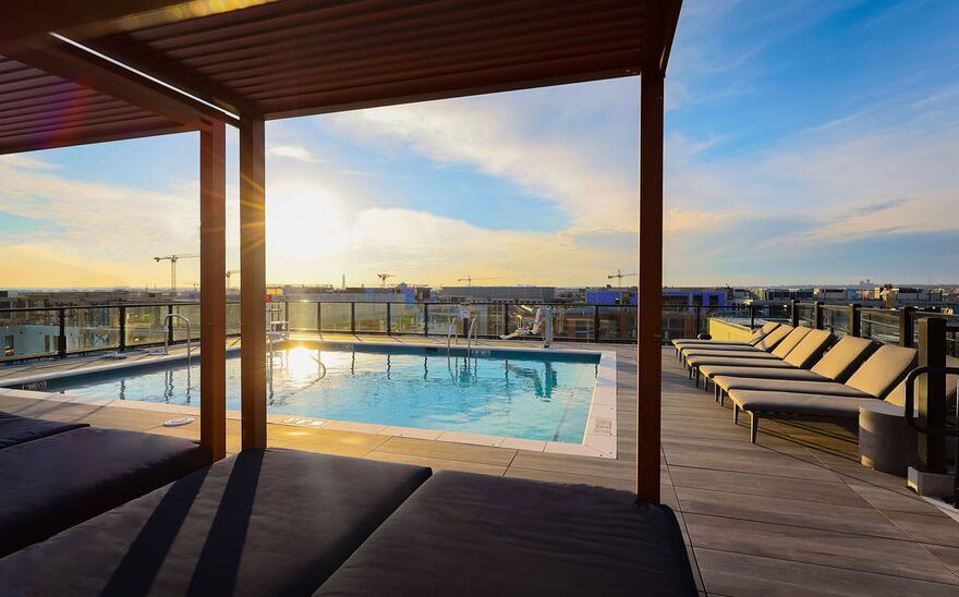 A central courtyard cut into the heart of the building offers an abundance of natural light throughout the property’s interior. The lobby, which includes a coworking space, leads to a multi-level fitness center and retro game room with pinball machines and billiard tables. The top floor of the building features numerous large party rooms, a dog run and a rooftop pool with 360-degree views of Washington.