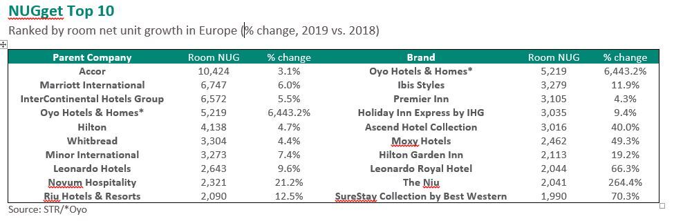 “As the industry evolves from looking at the size of the development pipeline to looking at net unit growth, we’re pleased to provide the first-ever leaderboard of NUG for individual brands and for parent companies that own portfolios of brands,” said Robin Rossmann, STR’s international managing director. “Many on this 2019 NUGget list for Europe are large global hotel chains that have accelerated their growth by focusing on both management and increasingly franchise business models in the European marketplace. That being said, large regional chains have also demonstrated their ability to grow significantly—helped by their increased flexibility in using leased and owned models of hotel ownership.”