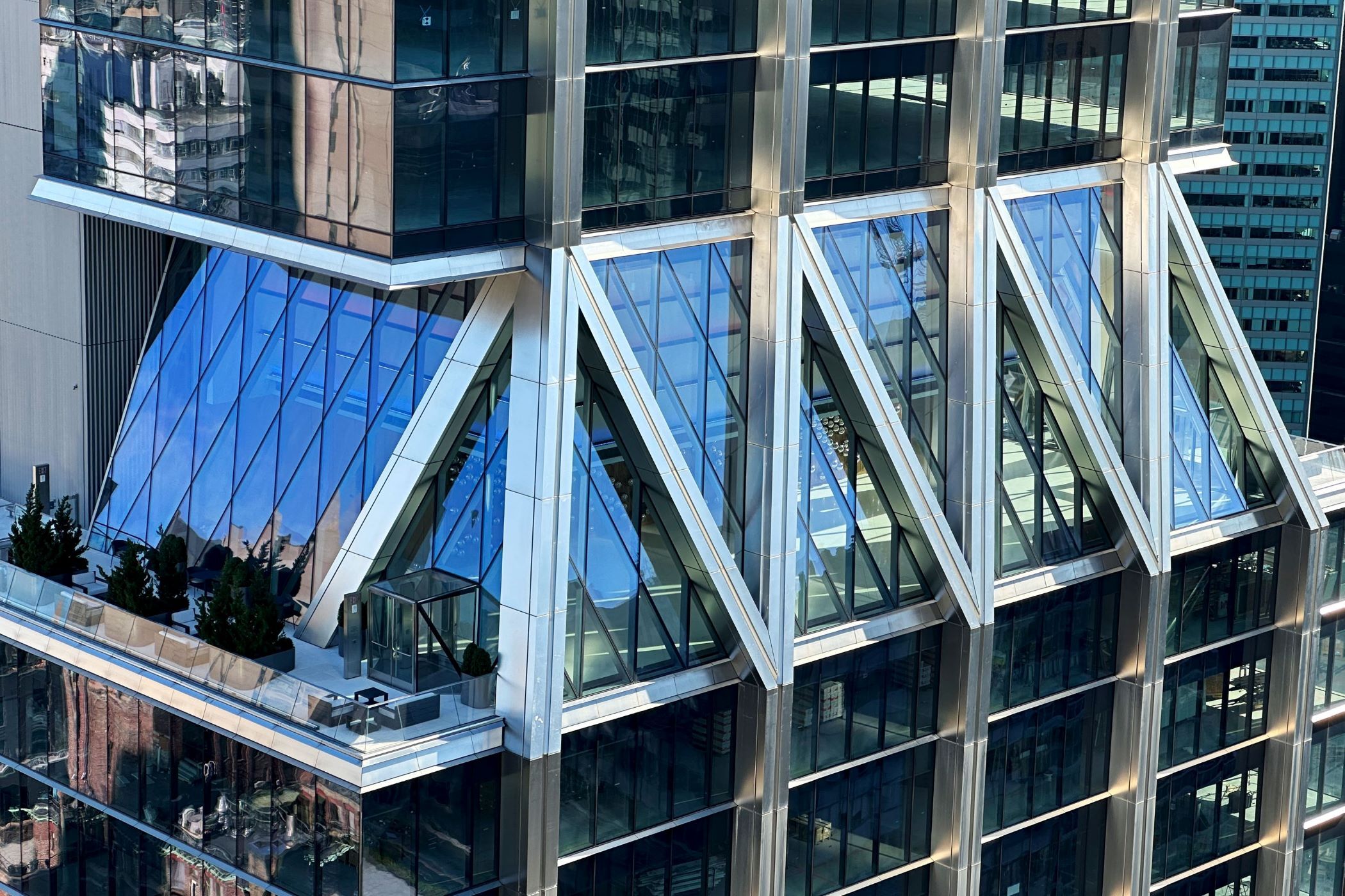 The uppermost diagrid on the 26th floor serves as the the Diagrid Club, open to all tenants. It features a coffee bar, kitchen, dining area and private event service with food and beverage operations to be overseen by the celebrity chef and restaurateur Jean-Georges Vongerichten, who also plans to create a two-level restaurant at the base of the the 670,000-square-foot building.