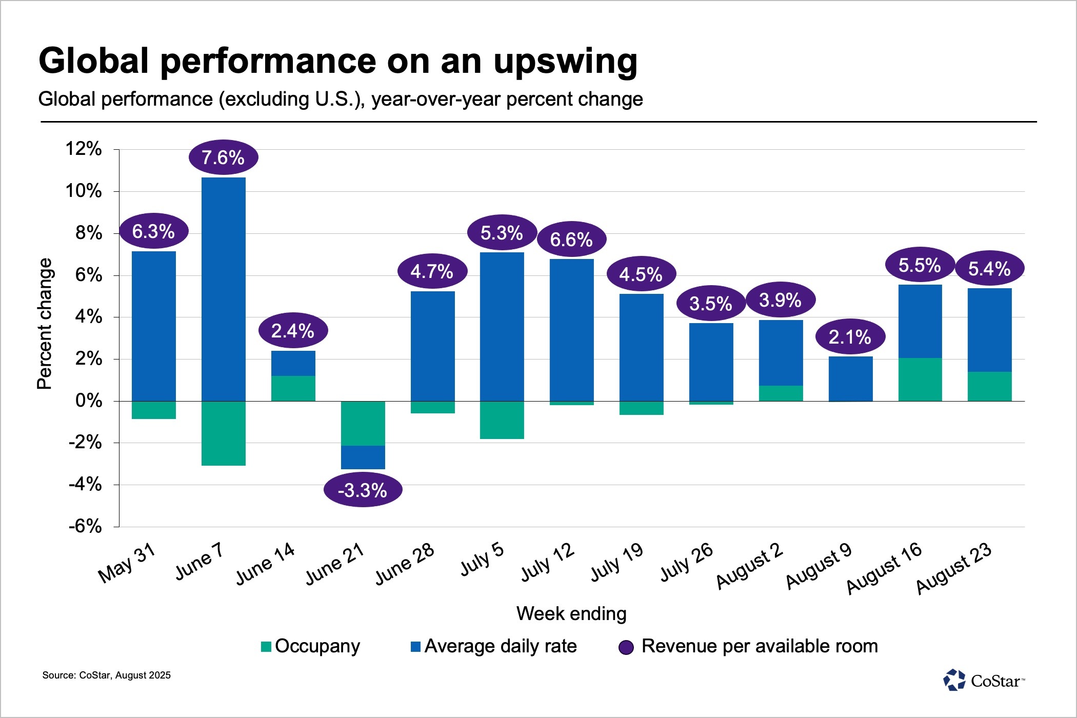 Global hotel RevPAR — excluding the U.S. and based on comparable reporting hotels — increased 5.4% for a second consecutive week after four straight weeks of lower growth due in part to the Olympic comp in France. This week, France hotel RevPAR was up 24% after a 7% gain in the prior week and double-digit declines in three weeks before that.