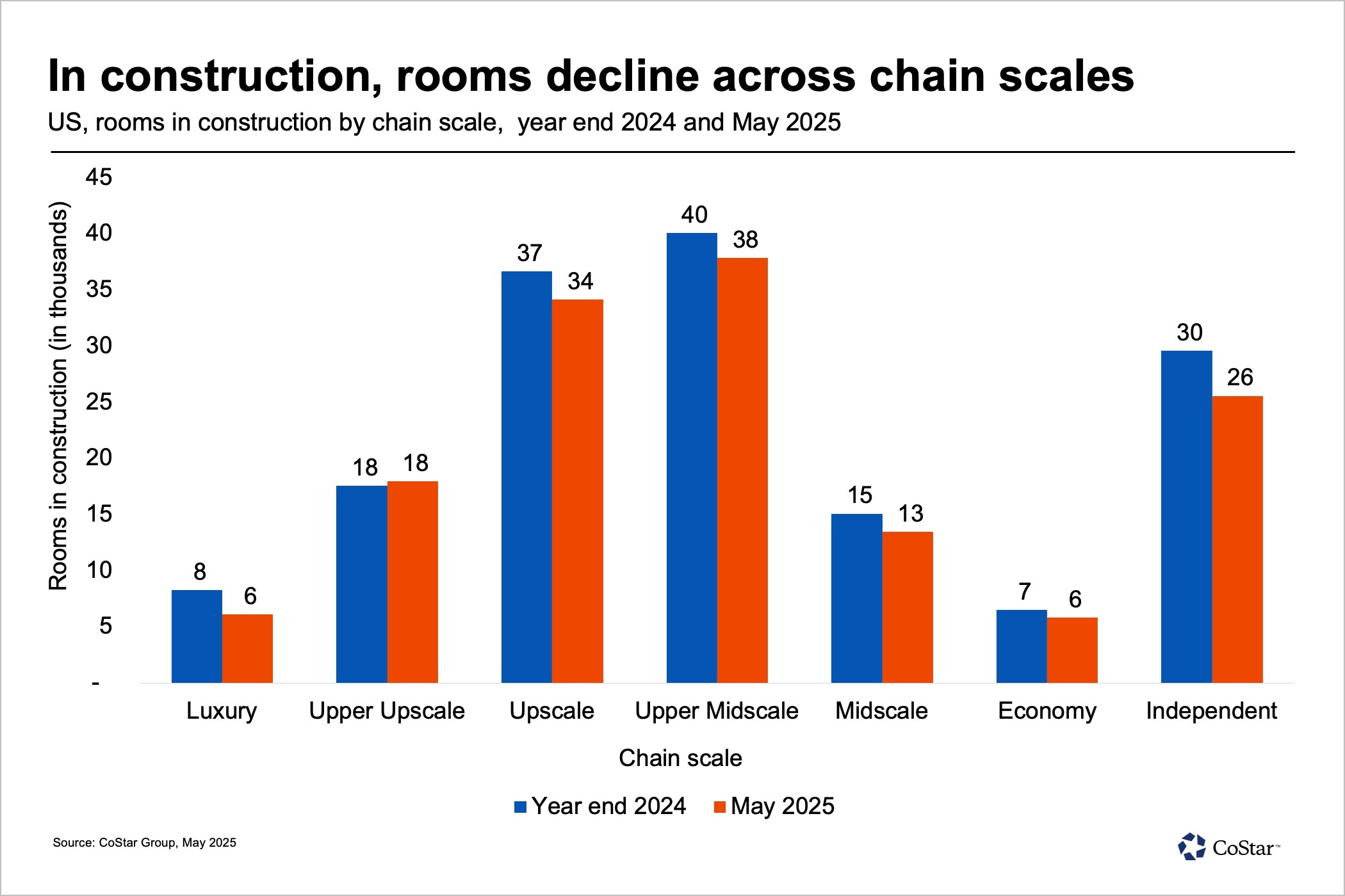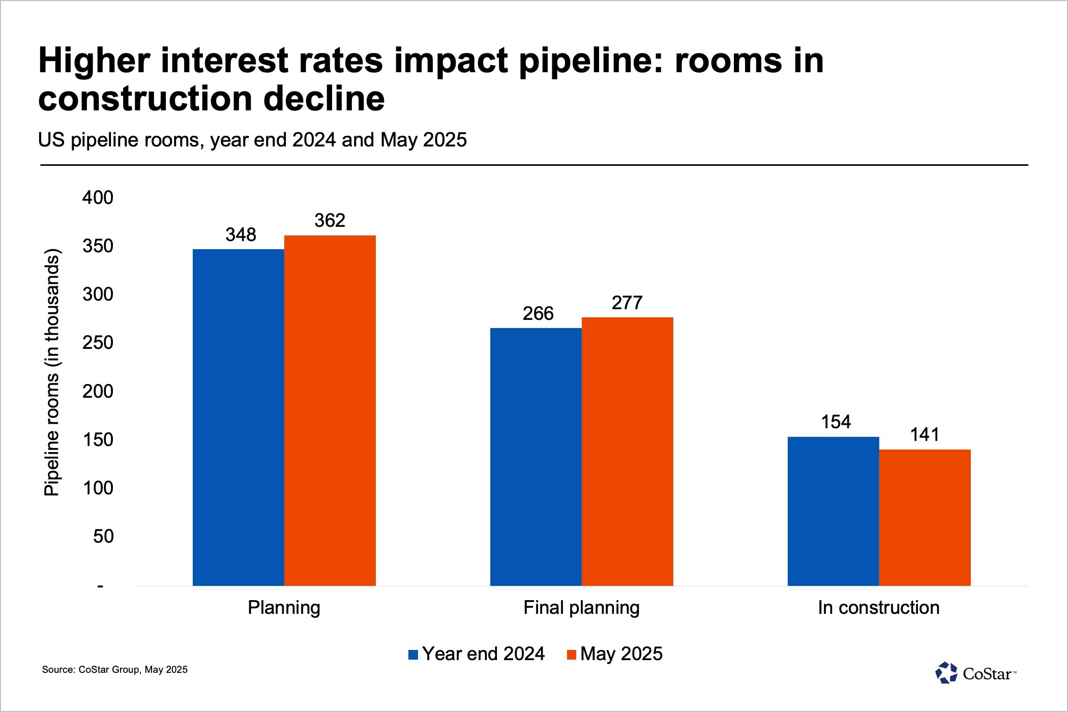 Gains, however, are not the word when it comes to the U.S. hotel pipeline, Freitag said. He pointed out that over the last four months, the number of hotel rooms in construction has declined, following a period of more than three years of low-but-steady numbers.