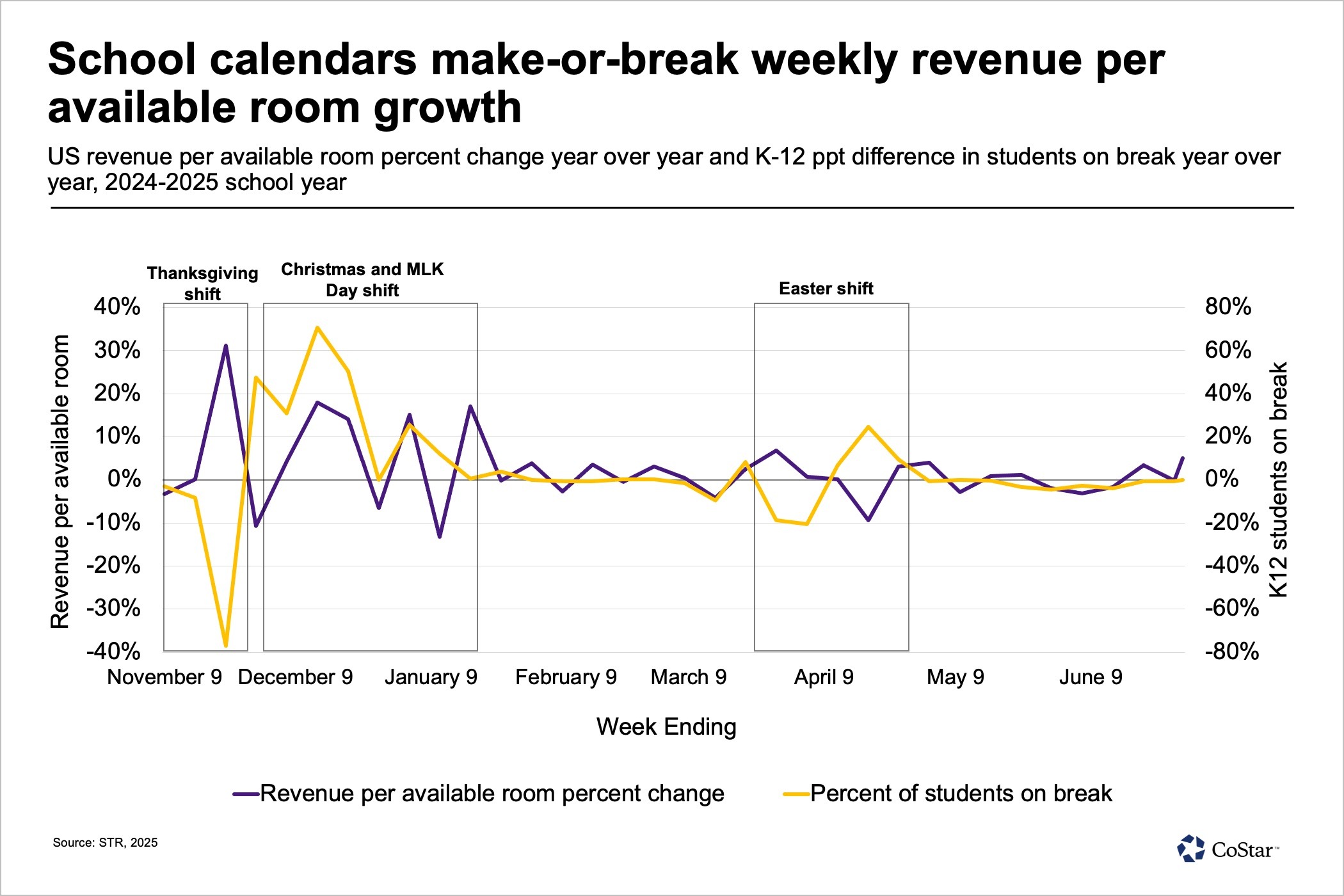 Leisure travel trends are having more of an impact on demand due to business travel never fully recovering to pre-pandemic levels, she said. Holidays that relate to school calendars are having an outsize impact on hotel performance, and it is making bigger ripples without the buffer of a business base.