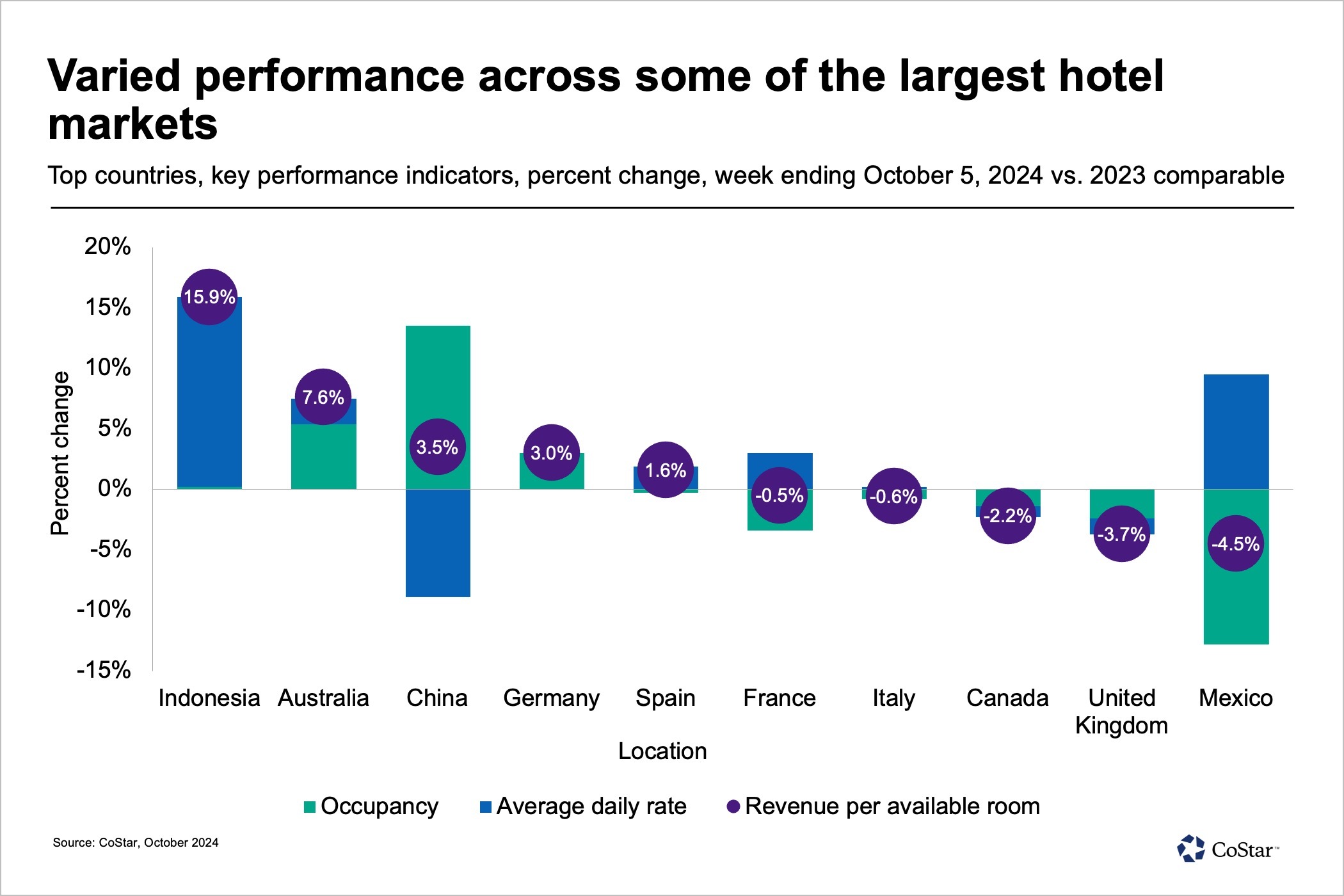 On the heels of strong gains the previous week, U.S. hotel performance for the period ending Oct. 5 showed the effects of Rosh Hashanah and Columbus Day/Indigenous Peoples Day calendar shifts as well as the impact of Hurricane Helene. Revenue per available room dropped 7.7% year over year with average daily rate retreating 4.4% and occupancy falling 2.3 percentage points.
