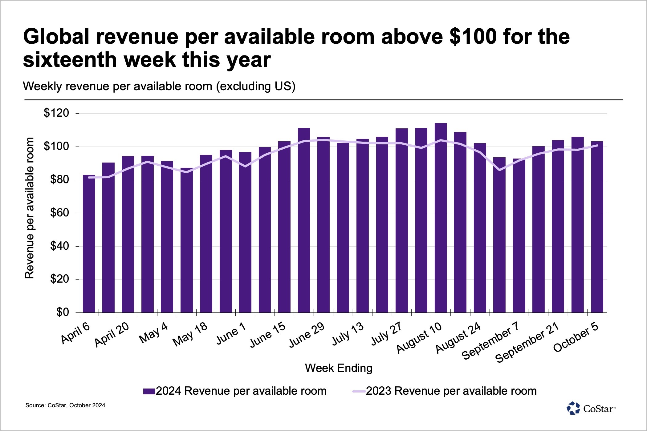 Global hotel RevPAR exceeded $100 for the 16th week this year