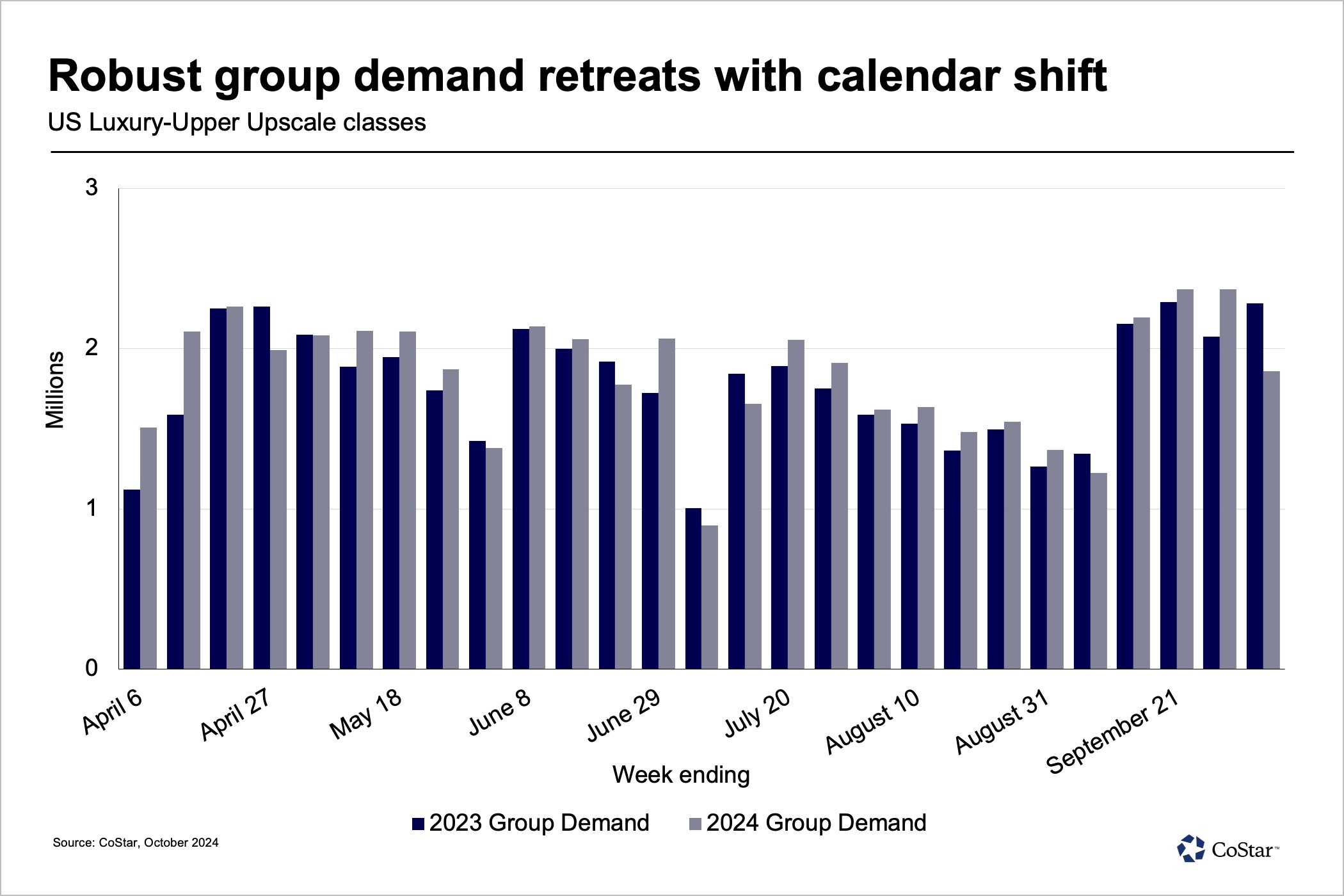 The week ending Oct. 12 should show improvement based on STR’s Forward STAR data even though Yom Kippur occurs at the end of that week; however, the impact of Hurricane Milton may soften this. Markets affected by both Hurricane Helene and Hurricane Milton will be monitored as recovery efforts take place. The remainder of October looks positive up until the week of Halloween, which occurs on Thursday this year.