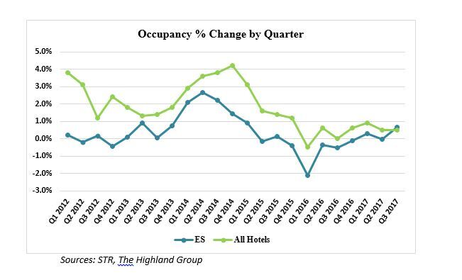 Like 2005 and 2006, rapid supply growth and strong increases in extended-stay ADR resulted in negative changes in extended-stay occupancy each quarter starting in mid-2015 with a trough in Q1 2016. Unlike 2005 and 2006, however, one year later, quarterly changes in occupancy turned positive, and in Q3 2017, strong demand growth produced an uptick in extended-stay occupancy, which reached an all-time high for Q3.