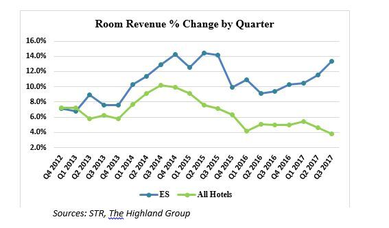 Seven to eight years into an expansion period, hotel demand growth usually decelerates and/or plateaus as it has done for the overall hotel industry since about since 2015. However, extended-stay demand growth has accelerated almost every quarter since Q4 2015.