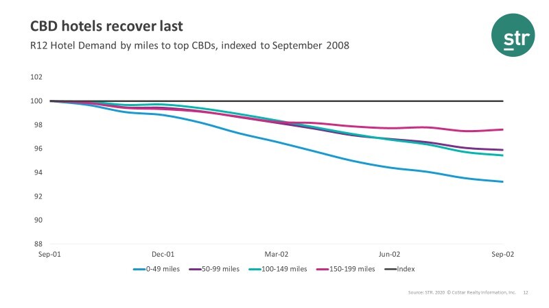 To measure recovery another way, we indexed rolling 12-month demand to the event month—in this case, the 9/11 terrorist attacks in September 2001, and the Lehman Brothers bankruptcy filing in September 2008. Looking ahead 12 months, the data shows which hotel set, based on distance from the CBD, recovered demand the fastest.
