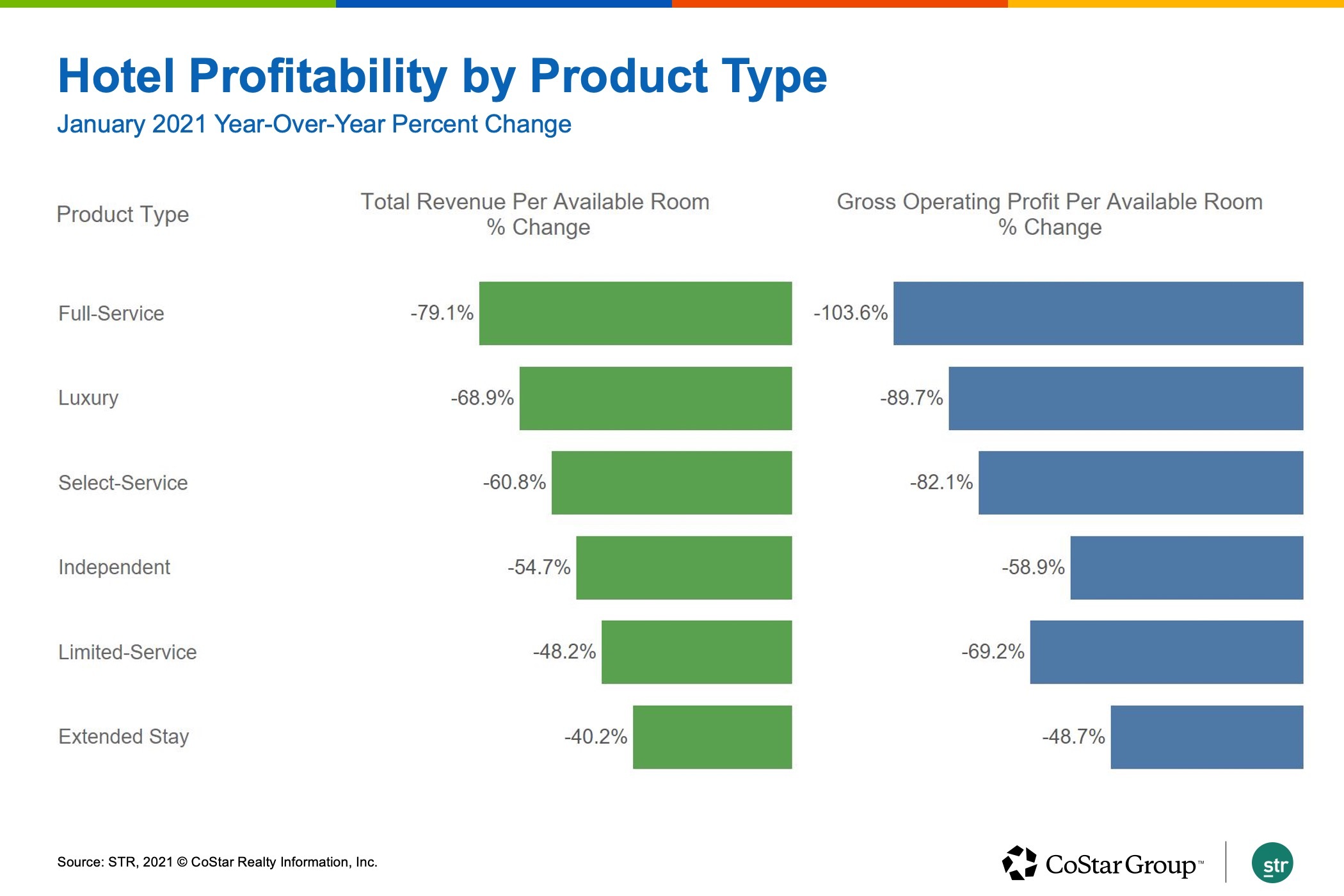 Larger hotels, not having their usual revenue streams from hosting events, experienced a 70.6% demand drop in January, yielding a sharp decline in total revenue per available room of 83.2%. The extra overhead costs that come with upkeep of larger properties and higher fixed costs posed an extra challenge to making a profit, thus equating to a sharp gross operating profit per available room decrease of 105.5% in January.