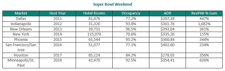 BROOMFIELD, Colorado—Minneapolis/St. Paul reported the highest increase in revenue per available room (RevPAR) for any Super Bowl host market since 2012, according to an analysis by STR’s Consulting & Analytics team.