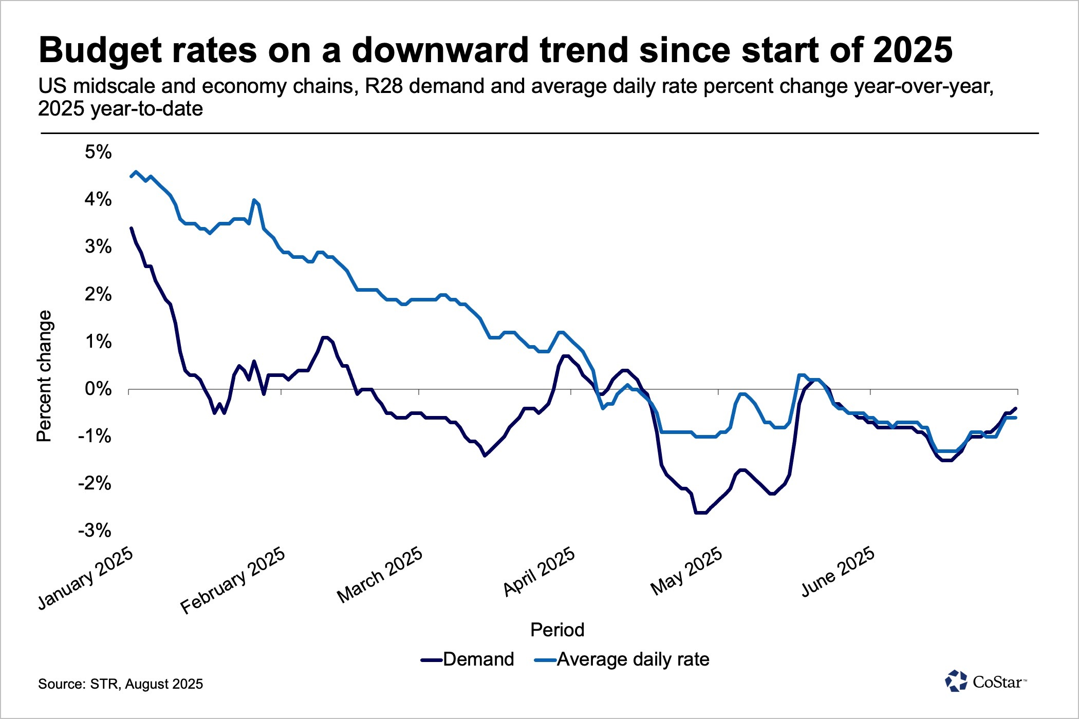 The rest of 2025 won't improve much for the U.S. hotel industry. CoStar and Tourism Economics released a revised forecast that anticipates a 0.1% full-year decline in revenue per available room.