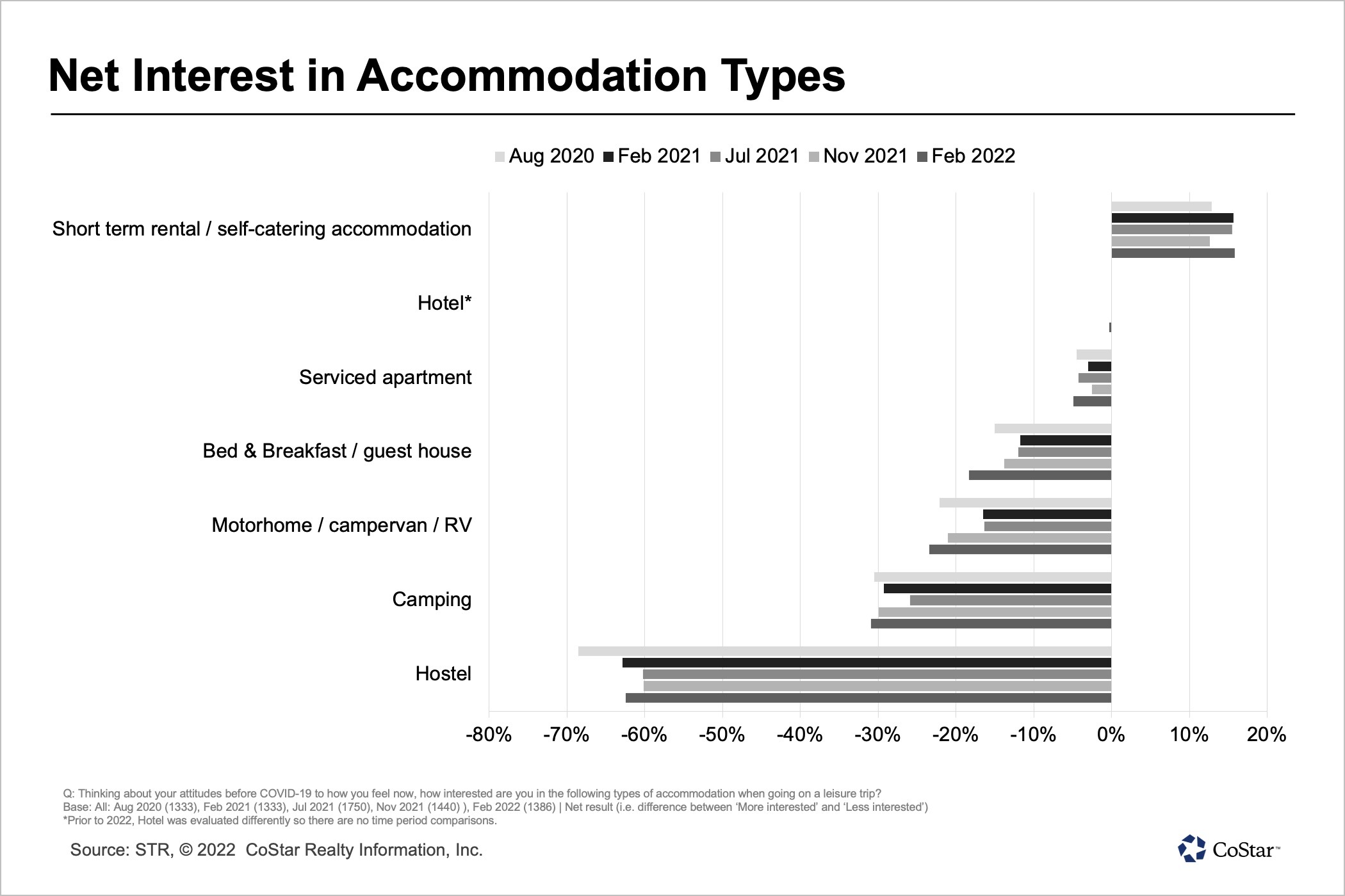 Results from this current survey cement the changes observed in accommodation preference due to the pandemic over the past two years. As has been the case throughout the pandemic, travelers are more interested in self-contained forms of accommodation. In STR’s latest survey, net interest for short-term rentals stood at 16%, which was similar with previous research conducted during the pandemic.