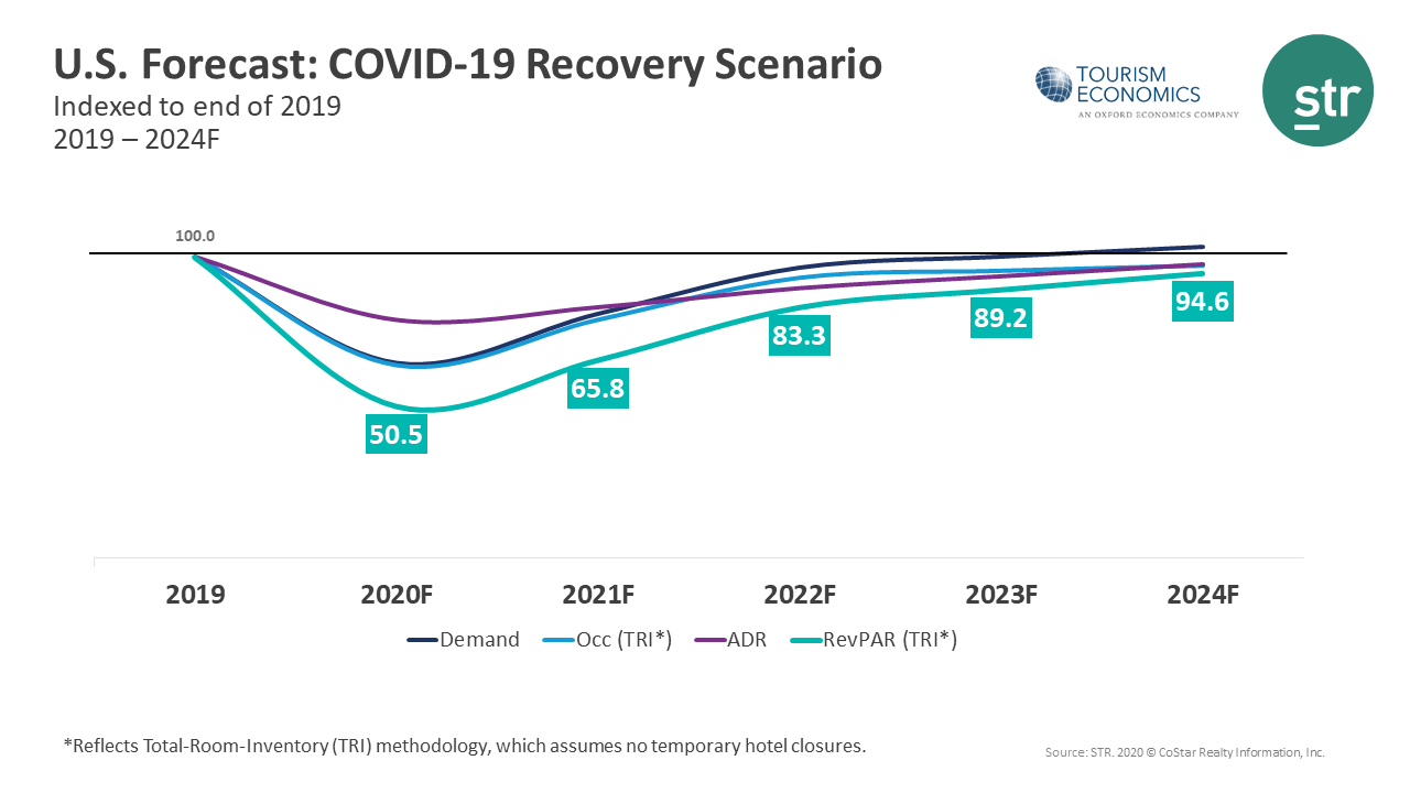 STR and Tourism Economics project the industry will recapture 80% of demand by the end of 2021, although RevPAR will be 34.2% lower than in 2019. Average daily rate (ADR) and revenue will follow a slower recovery timeline, putting the industry on pace for full demand recovery at the end of 2023 and a return to pre-pandemic RevPAR levels by the close of 2024.