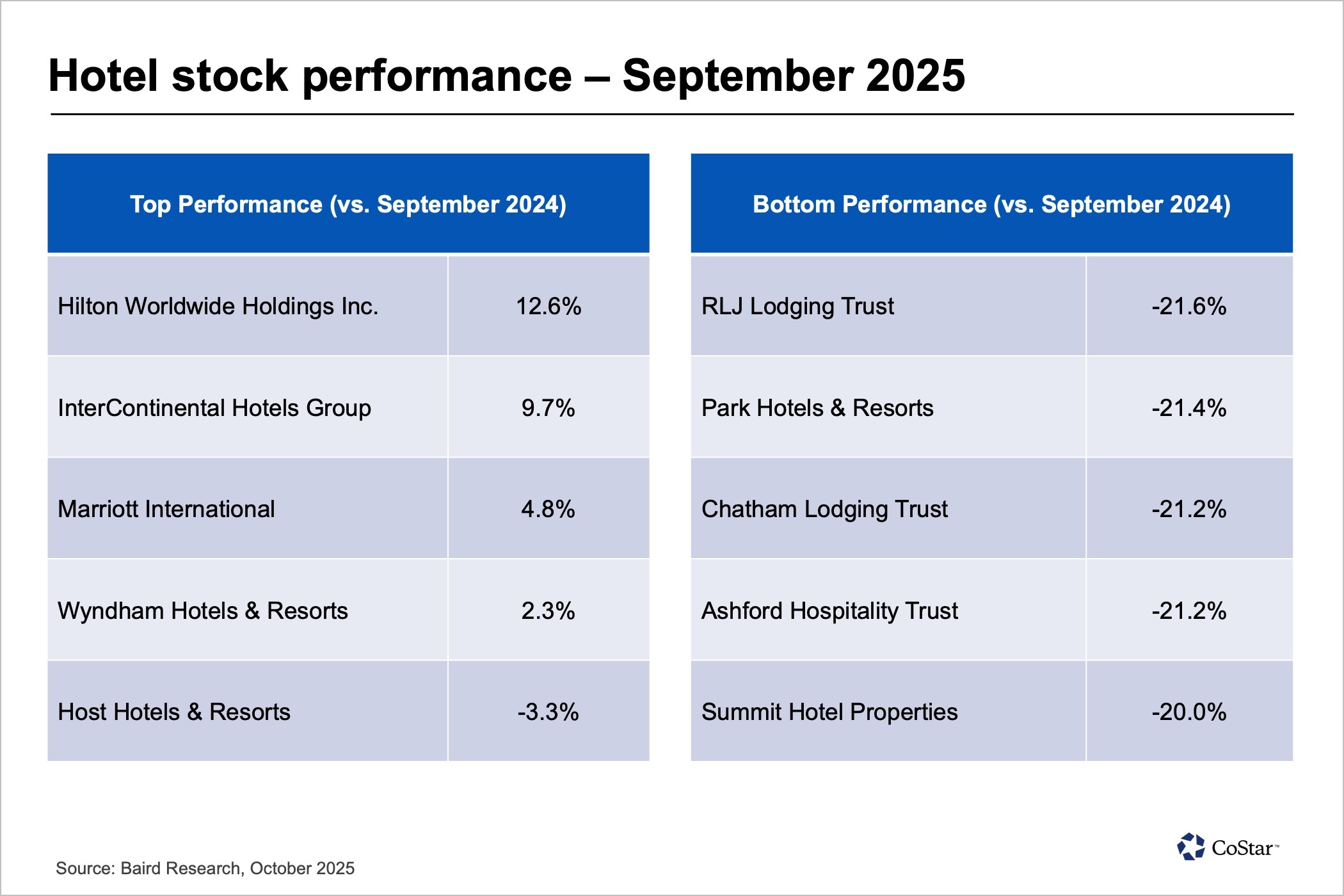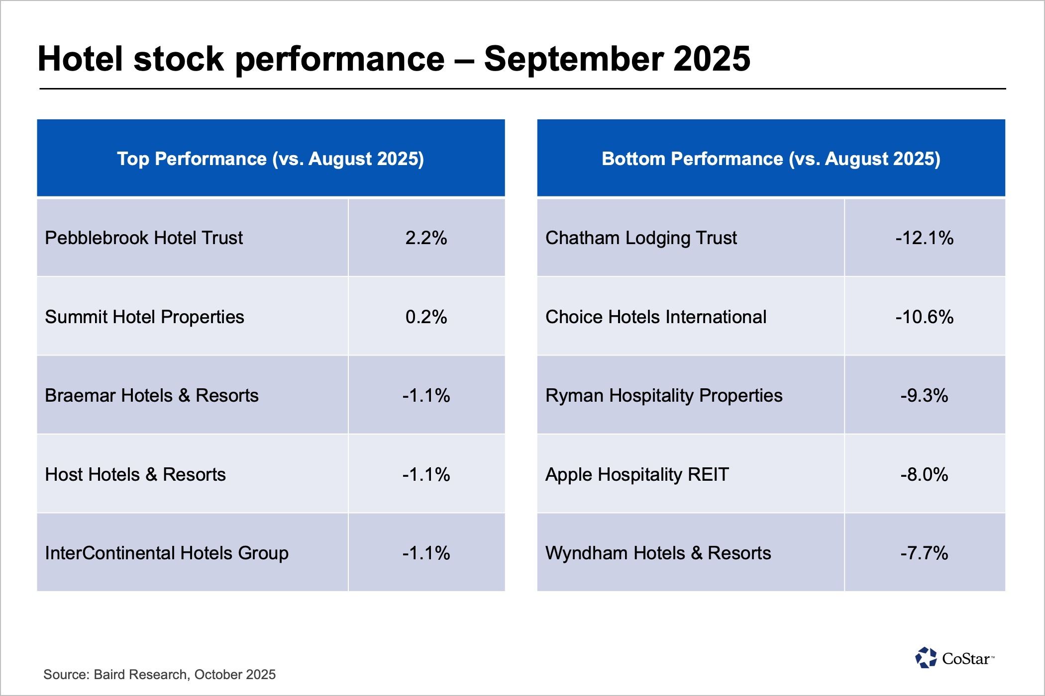 The Baird Hotel Stock Index — which comprises 20 of the largest hotel brand companies and real estate investment trusts publicly traded on a U.S. stock exchange by market capitalization — fell 4.1% in September, its largest decline since March. The index has decreased in five of nine months in 2025.