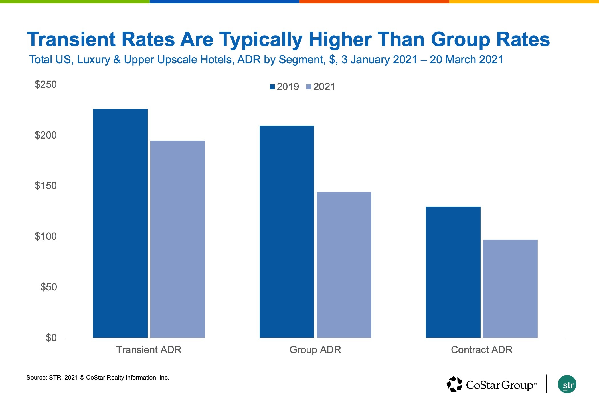 Splitting luxury and upper-upscale ADR into its three component parts reveals the secret to the segments' seeming ADR success over the past year. Group demand contributed $74 to total ADR in 2019, a figure which shrank nearly 70% in 2021 as groups canceled or dramatically changed their events.
