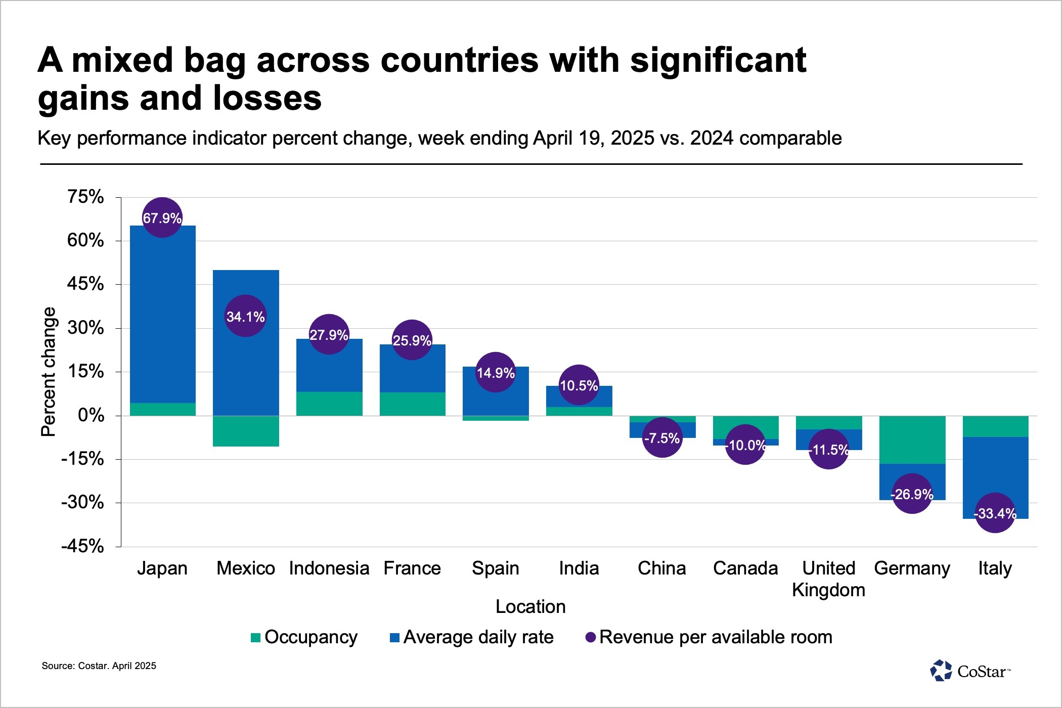 On the flip side, Italy, Germany, the United Kingdom and Canada all posted double-digit declines due to event calendar shifts and the Holy Week slowdown. China also saw RevPAR decrease 7.5% on a combination of ADR and occupancy declines. RevPAR had declined in China in 15 of the past 16 weeks, mostly on falling ADR.