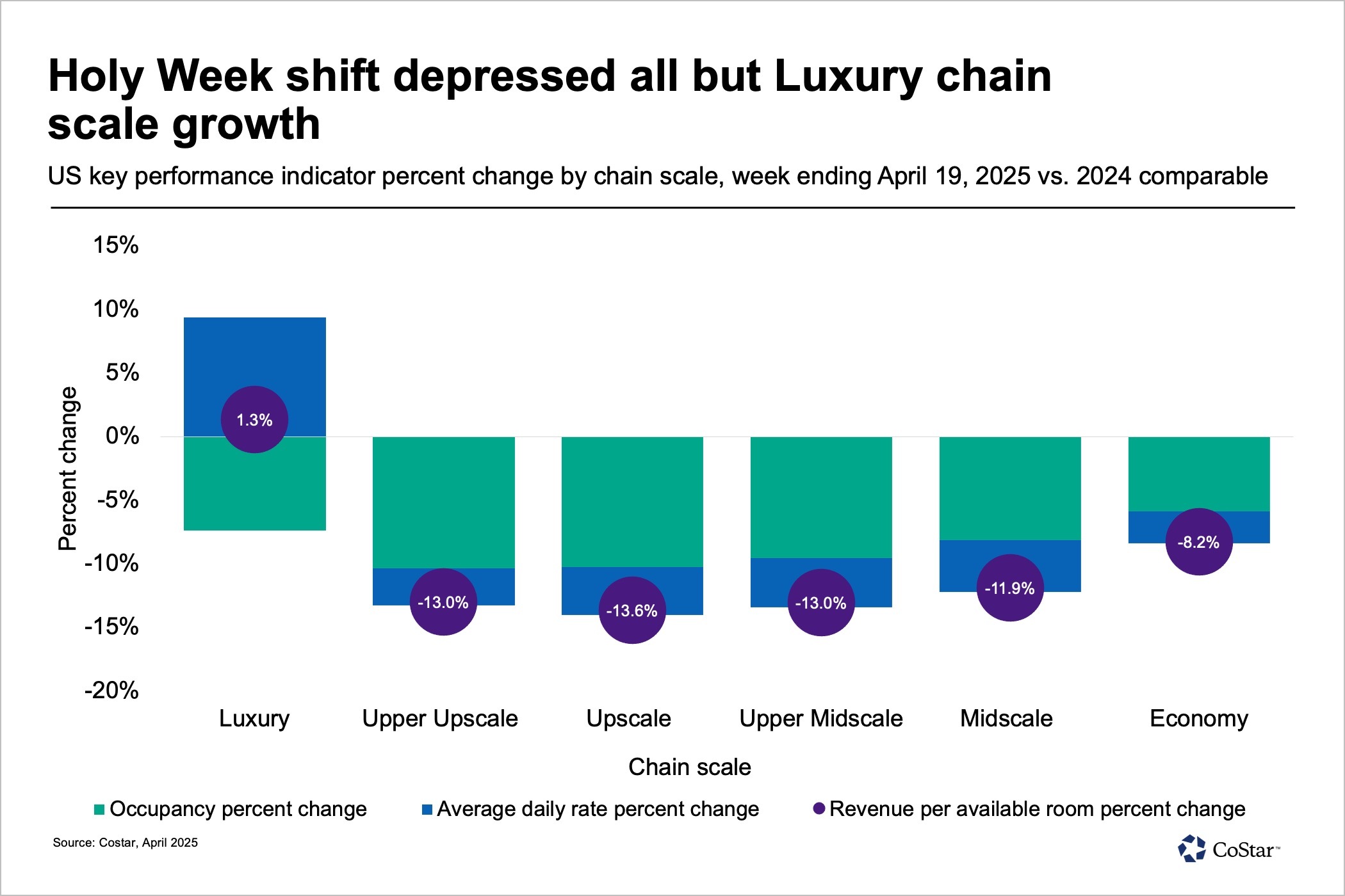 In the week of April 13-19, 2025, U.S. hotel revenue per available room (RevPAR) fell 9.3%, with occupancy declining 5.4 percentage points and average daily rate (ADR) dropping 1.3%. The decrease was expected given that Passover began on the evening of Saturday, April 12 as well as Holy Week, the seven days before Easter on Sunday, April 20. This resulted in lower travel demand along with a difficult comparison to last year given that Easter was in March and Passover was later in the month.