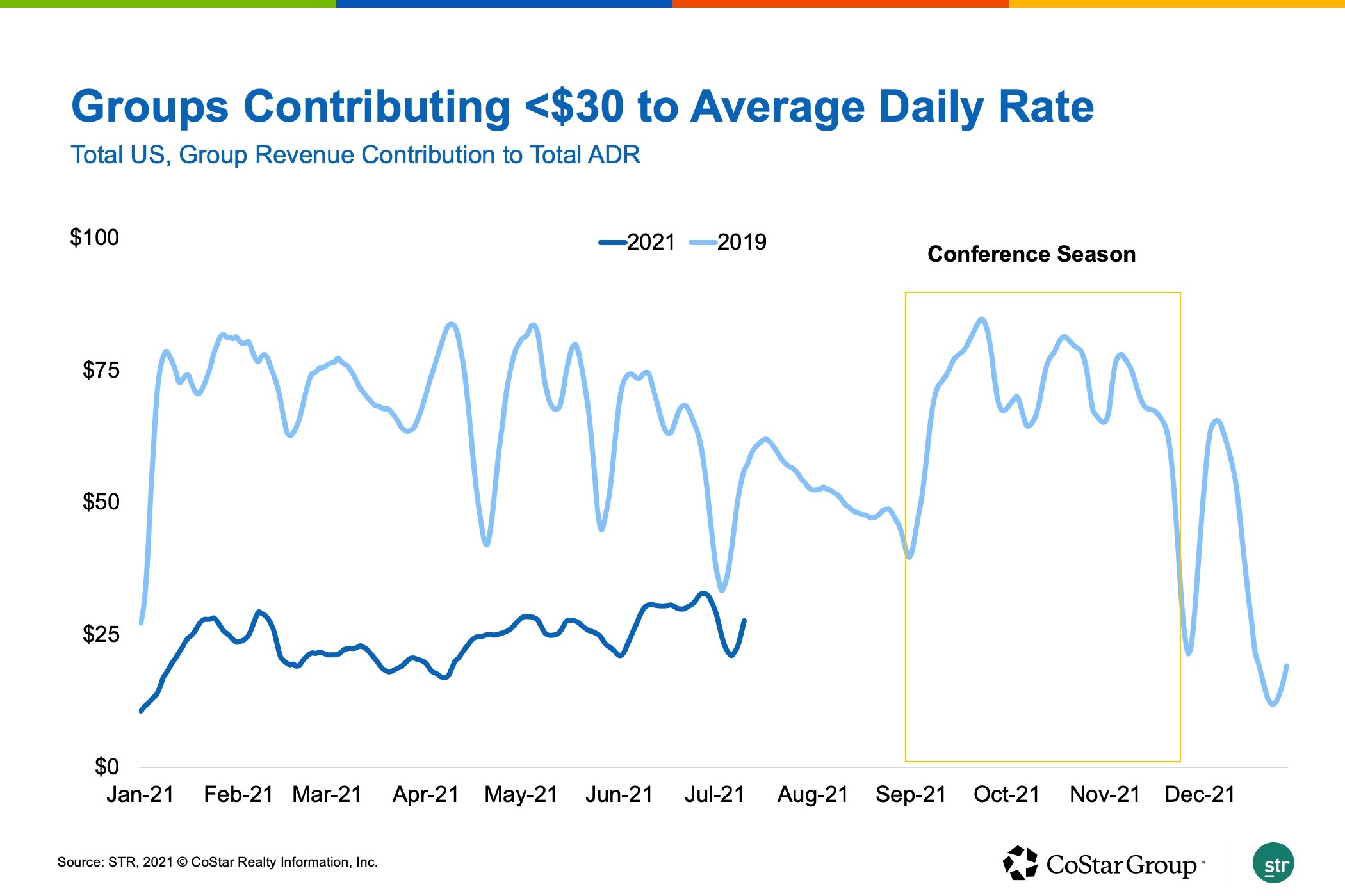 This spells concern for the industry, as the groups that normally replace leisure travel over the transitory fall months aren’t expected to return in significant numbers until early 2022. Groups currently contribute less than $30 to luxury and upper upscale hotel ADR, which came in at $235 for the week ending July 10, a staggering $24 increase over 2019.