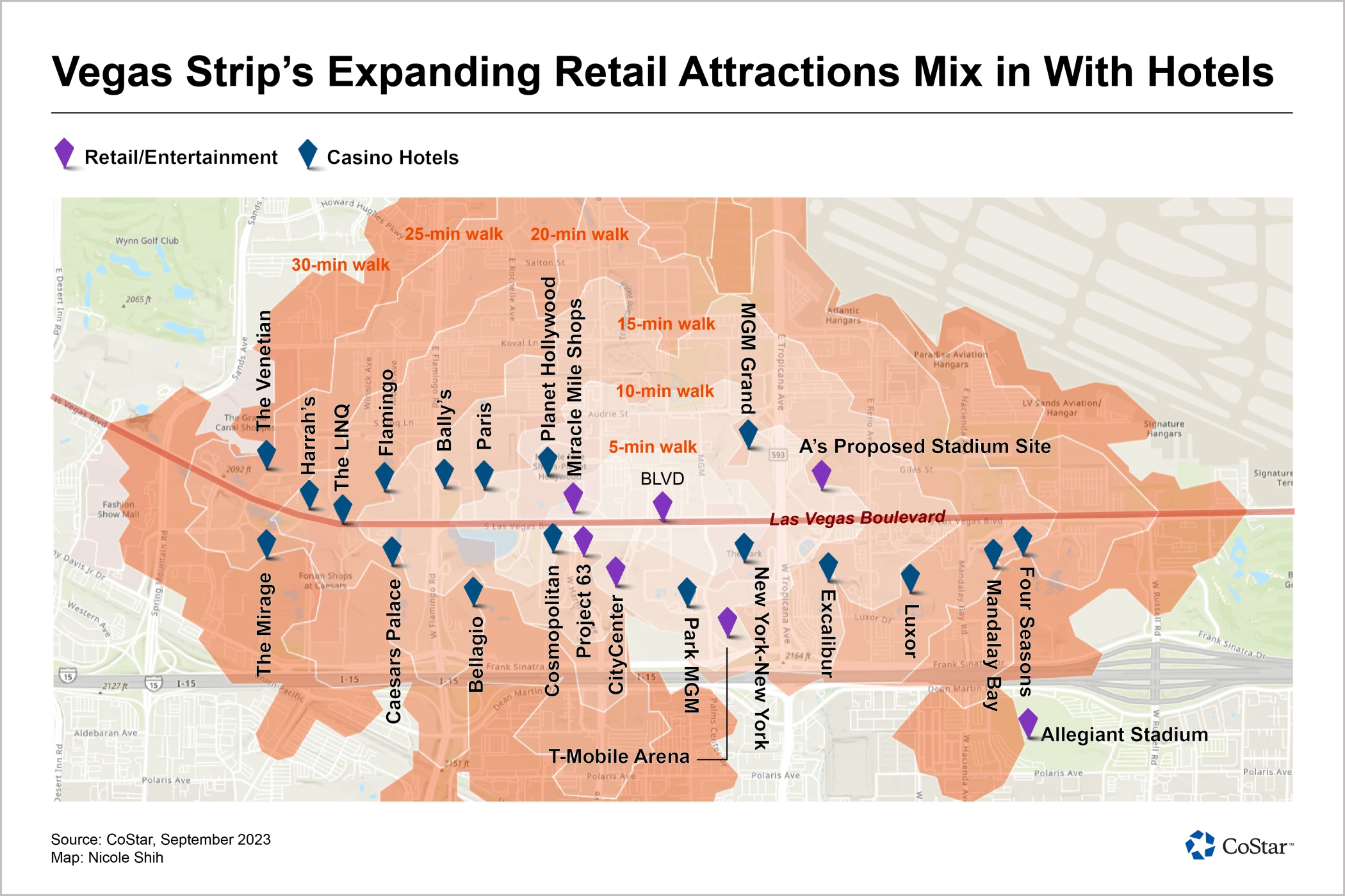 The retail vacancy rate for the resort corridor, basically the Strip, is 4.1%, lower than the vacancy rate for the larger Las Vegas metropolitan region at 5.2%, according to CoStar data. Retail annual rent growth is 9.9% for the resort corridor, compared with 7.8% for the market at large, according to CoStar. The existing and coming sports arenas should be a boost.