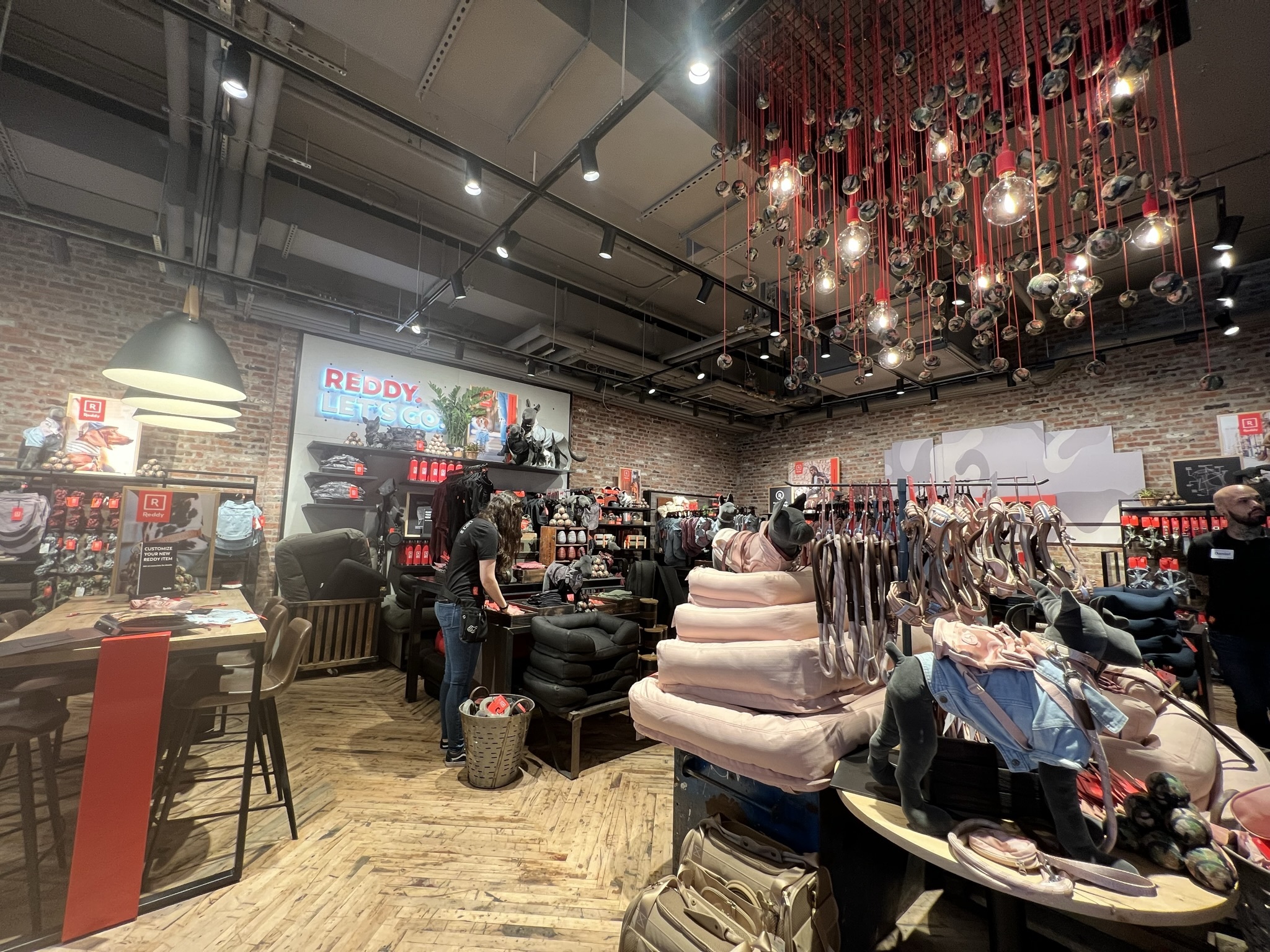 That experience includes a photo booth, a harness fitting station for dogs of different sizes or a customization area for pet owners to personalize their pet gear. One of the most telling examples is a pet grooming salon, right by the entryway and can be seen through the store window from outside as well, that’s designed to look like an upscale barber salon with a shop chair for pet owners to photograph their beloved pet children in.