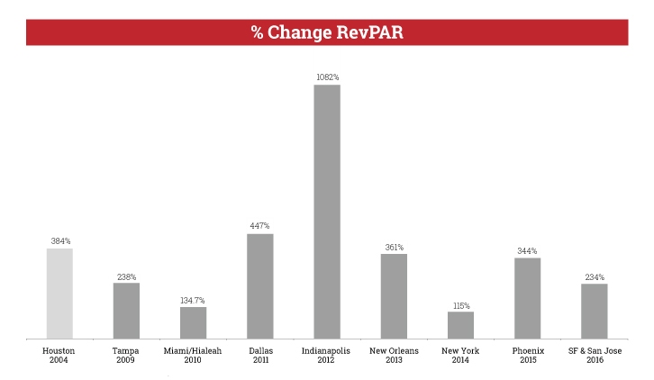 Overall, while it’s difficult to forecast, it’s not unreasonable to think Houston hotels could experience a RevPAR increase of between 150% and 350% during Super Bowl weekend this year. But there’s no question a Super Bowl provides a tremendously positive impact for any host city.