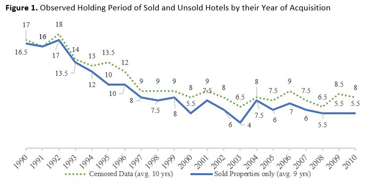 In 2019, nearly $40 billion worth of hotels were sold in the U.S. alone. Holding period determines the effectiveness of owners’ capital improvement budgets as well as tax planning, lenders’ call protection measures, and above all, transaction consultants’ business opportunities. Our conservative estimates suggest that in 2019 fees charged by lenders and consultants related to hotel transactions alone would have been approximately $200 million to $1.2 billion. Interestingly, our knowledge of what determines the holding period (or sale decision) of a hotel is very limited. Figure 1 shows that holding periods exhibit substantial variation over time. We attempted to explain the variation in our forthcoming research paper . In this article we provide a few excerpts from it.
