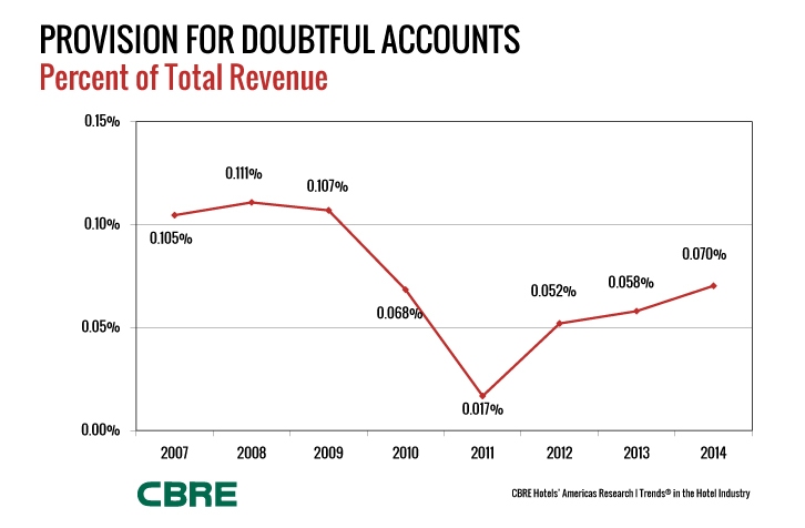 Since then we have seen a slight uptick in the provision for doubtful accounts as a percent of revenue, however, the 0.07% mark posted in 2014 is still lower than the pre-recession 2007 figure of 0.105%. We attribute the decline over the seven-year period to the increased use of credit cards, which gives some degree of greater assurance of collection.